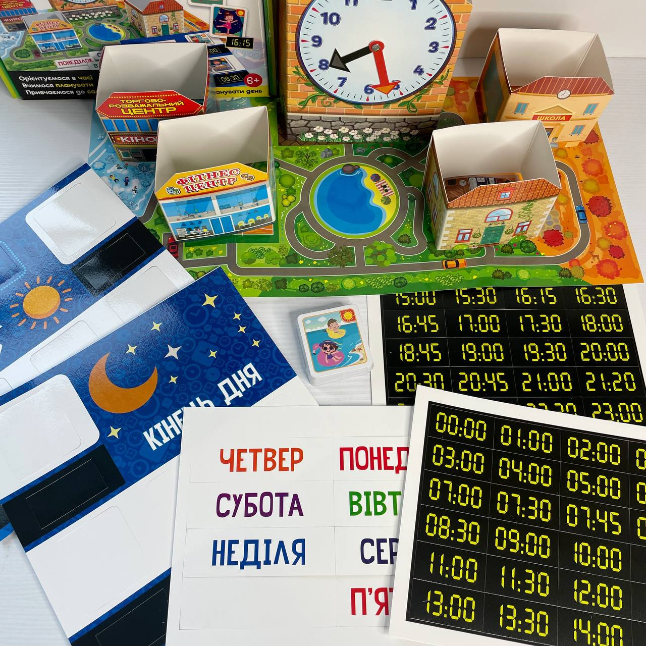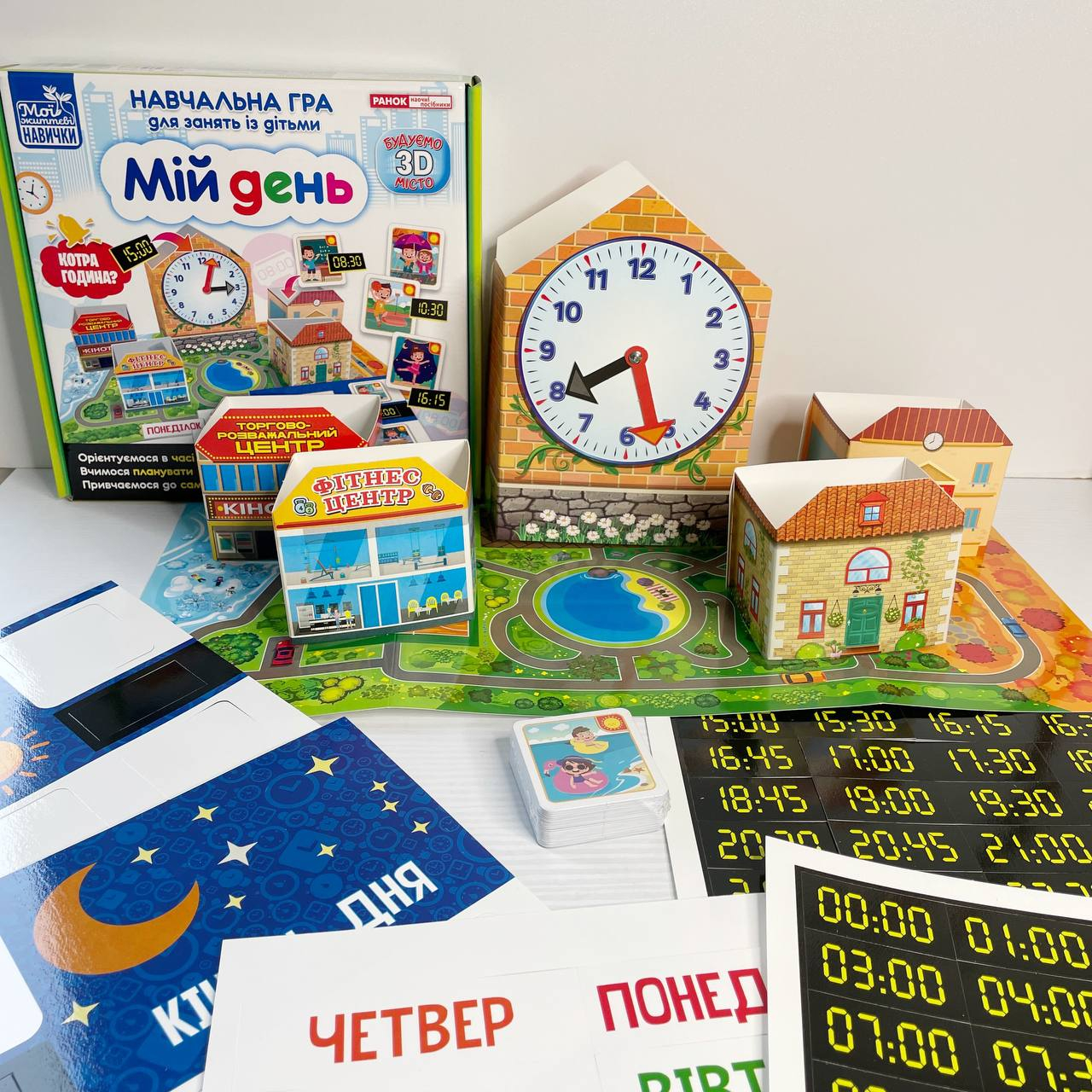 Іноді навіть дорослим складно спланувати свій день. Але ж діткам ще важче! Яскраві картинки, об’ємні 3D-будинки та 3D-годинник із рухомими стрілочками допоможуть дитині зрозуміти важливість режиму дня та правильного планування своїх справ. Маленький гравець ніби потрапляє у світ дорослих і сам ухвалює рішення та планує, що, де і коли робитиме. Мета гри: навчити дітей продумувати свій день, дотримуватися правильного режиму й орієнтуватися в часі. Зробіть гру частиною навчання з новими варіантами розваг! Перед початком захоплюючої гри розмістіть годинник на ігровому полі та зберіть будинки. Розкладіть картки по порядку та уважно їх розгляньте. Чи готові ви обрати гру, яка розвине ваші навички та знайомство з часом?