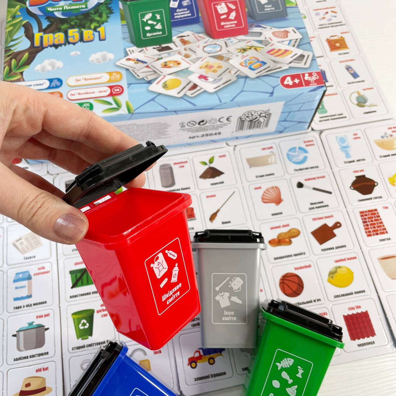 Набір містить картки із зображеннями предметів, які потрібно відсортувати. Завдання дитини - роздивитися ці предмети та розмістити їх у відповідні смітники. Наприклад, пластикова пляшка піде у смітник для пластику, стара газета - у смітник для паперу, залишки харчових продуктів - у смітник для органічних відходів, а скляна пляшка - у смітник для скла.