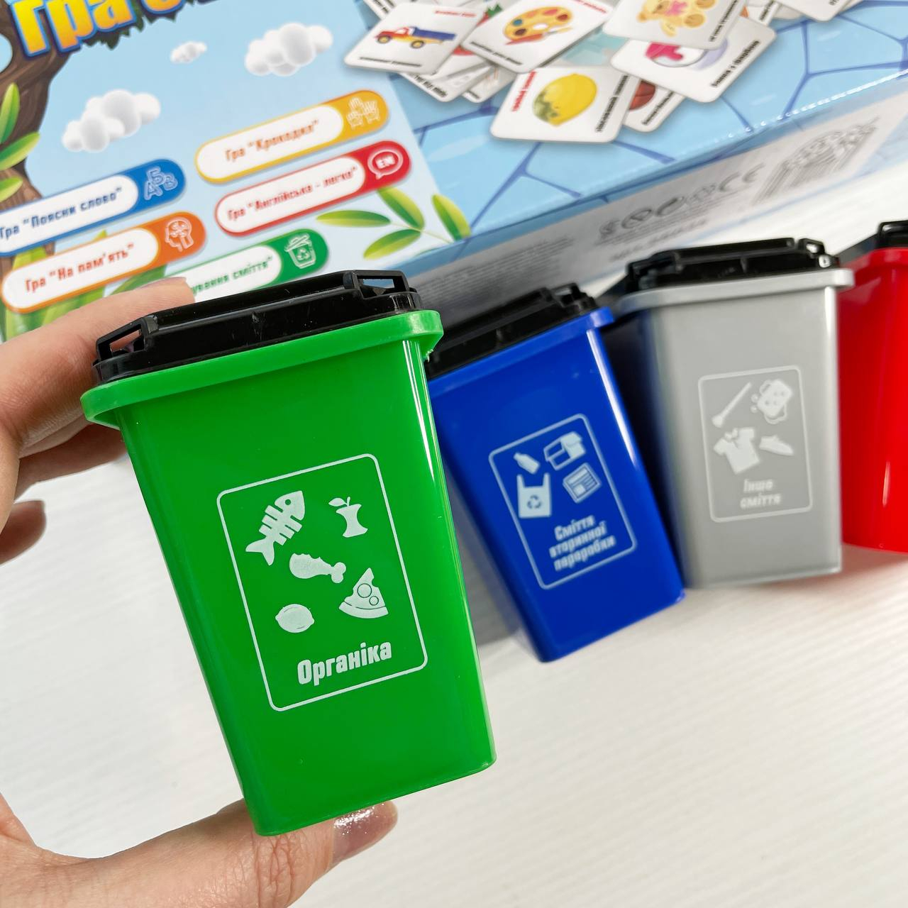Ігровий набір складається з 4-х кольорових смітників, кожен з яких відповідає певному виду сміття: пластик, папір, скло та органічні відходи. Кожен смітник має яскравий колір і відповідне маркування, що допомагає дитині легко визначити, куди потрібно викидати певний вид сміття.