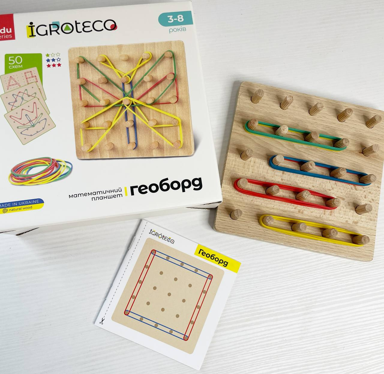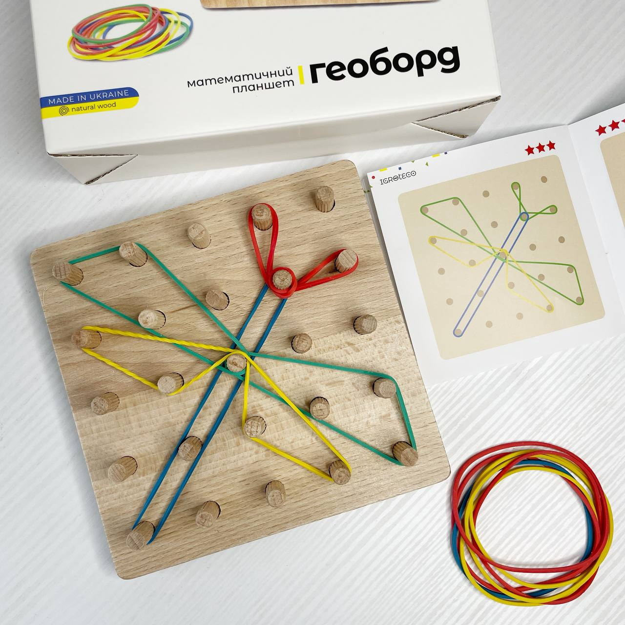 Розміри планшета 15х15 см, в наборі 12 кольорових резинок і книга із завданнями