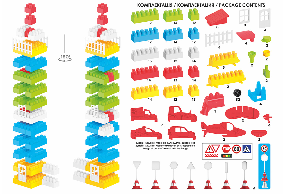 Цеглини різних розмірів, віконця, двері та парканці для будівництва будиночків та замків. Набір дорожніх знаків, фігури машинок та літака стануть у пригоді для ігор з гаражами та паркінгами.