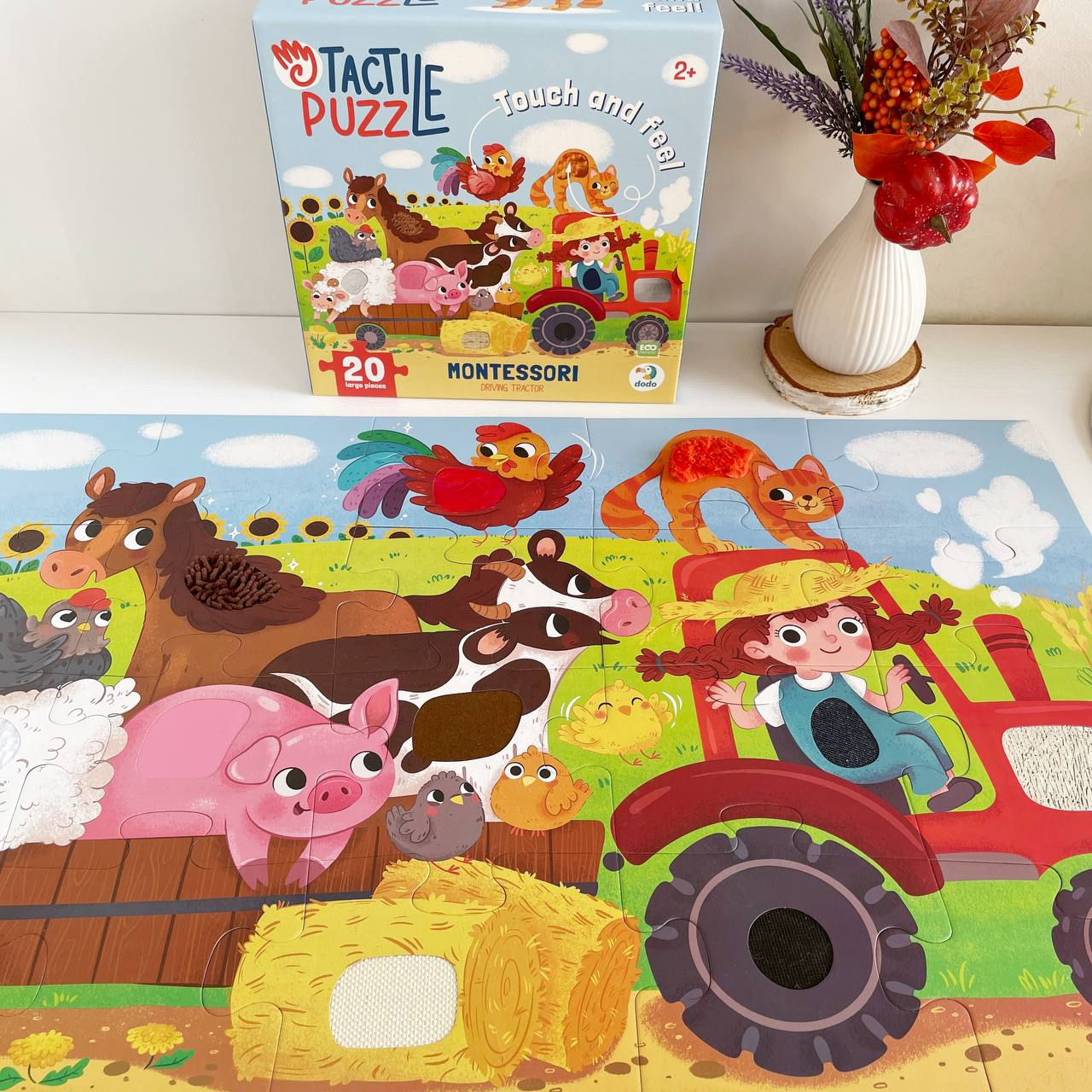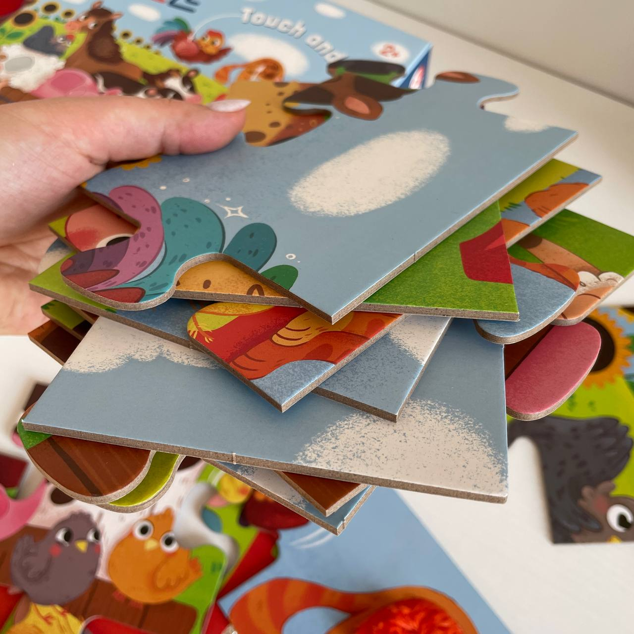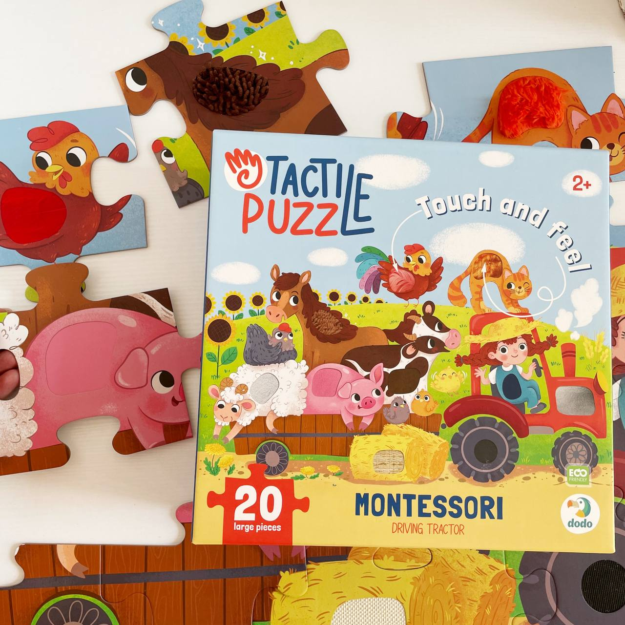 Цей барвистий пазл розроблений спеціально для маленьких дослідників віком від 2 років, щоб весело знайомити їх зі світом тварин, техніки та фермерського життя через гру та сенсорні відчуття.