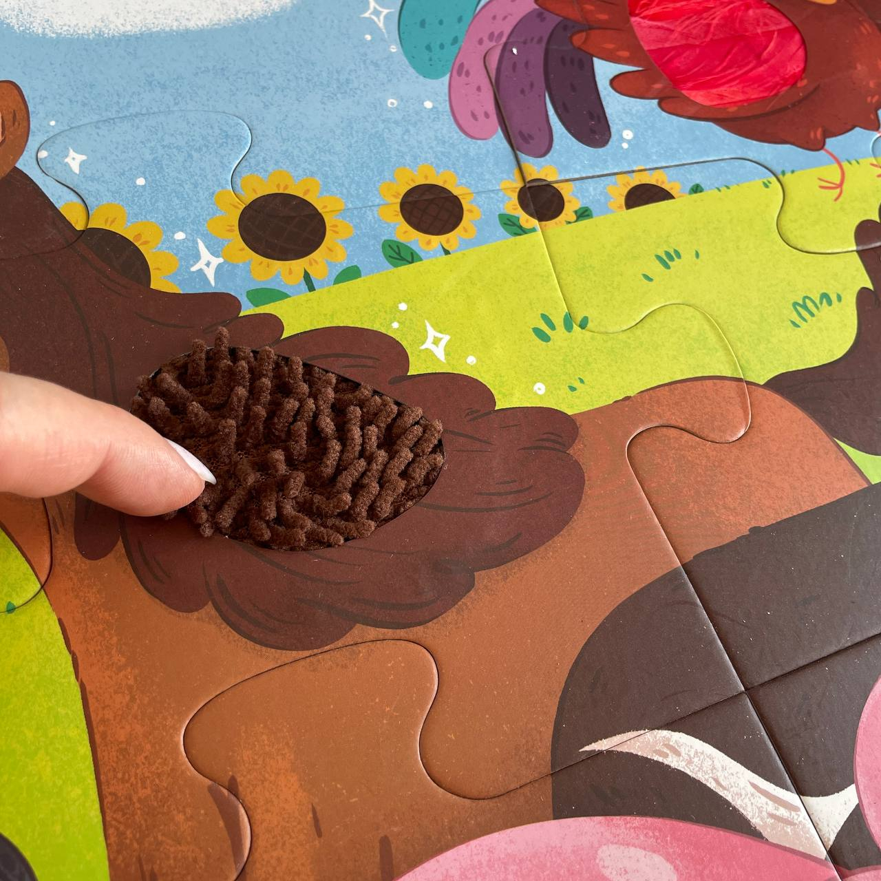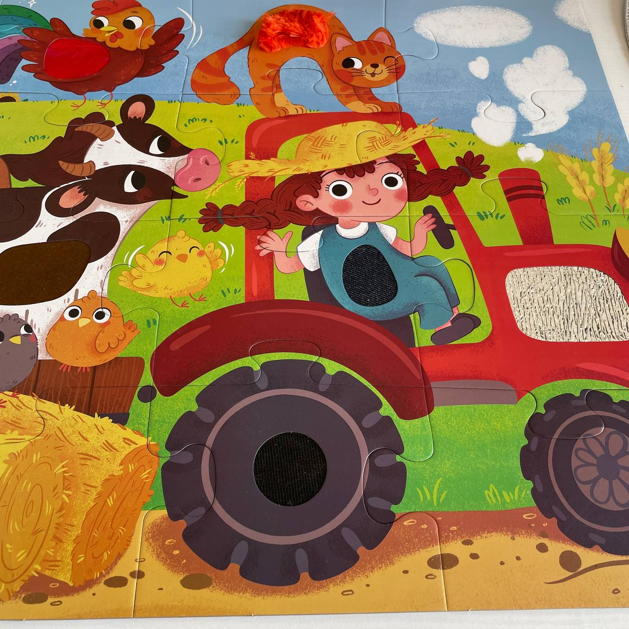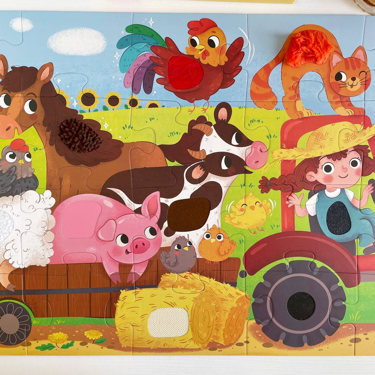 Оригінальна особливість – тактильні вставки: у деталях пазлу, таких як овечка, свинка, трактор та інші елементи, є м’які фактурні поверхні, які сприяють розвитку сенсорних навичок у дітей.
