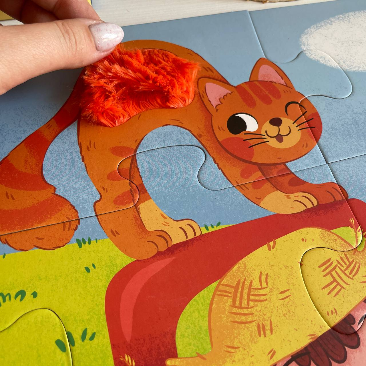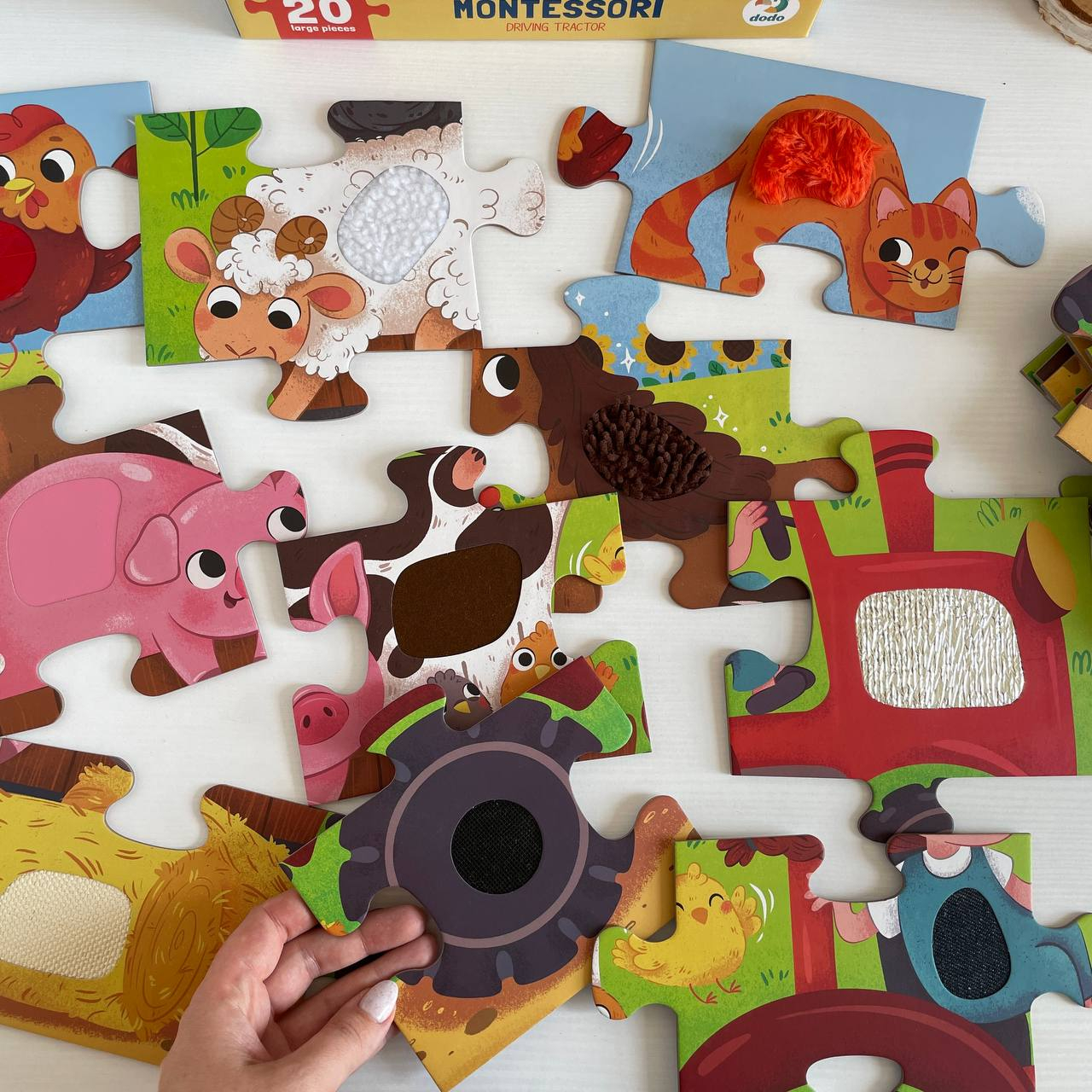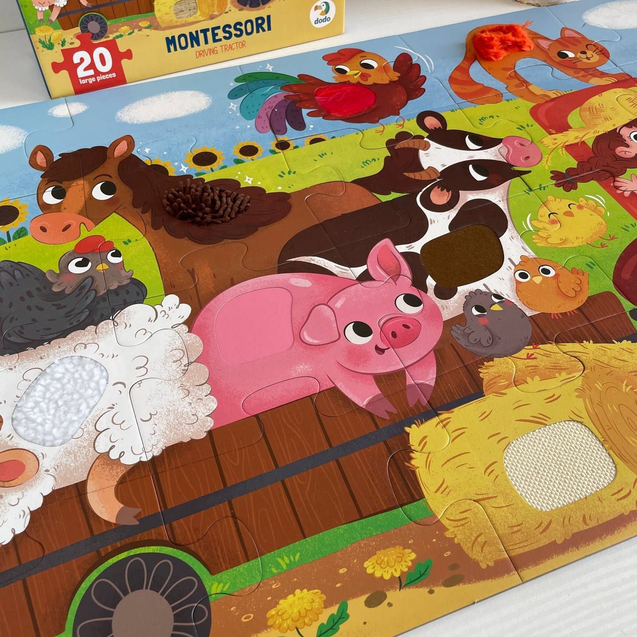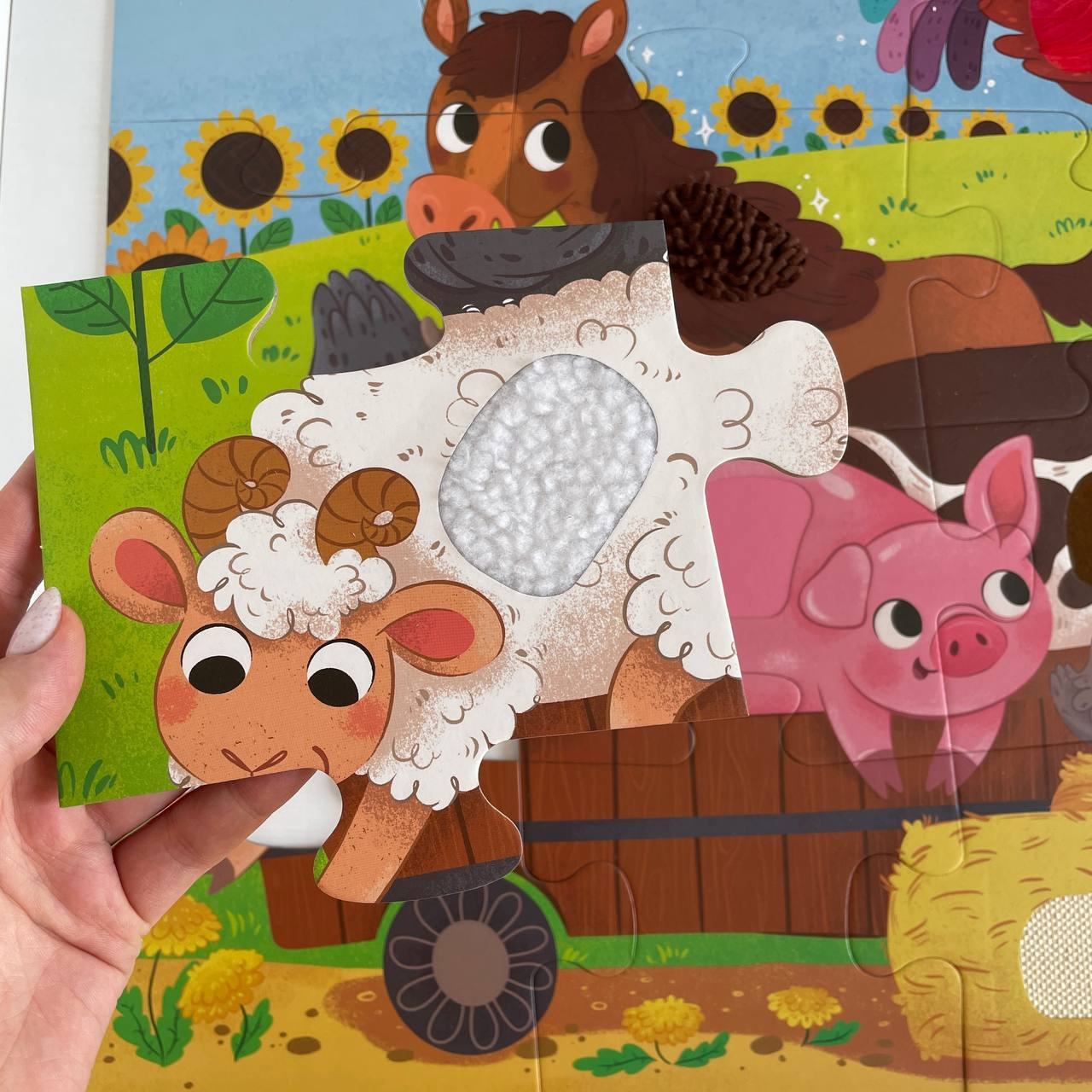 Оригінальна особливість – тактильні вставки: у деталях пазлу, таких як овечка, свинка, трактор та інші елементи, є м’які фактурні поверхні, які сприяють розвитку сенсорних навичок у дітей.