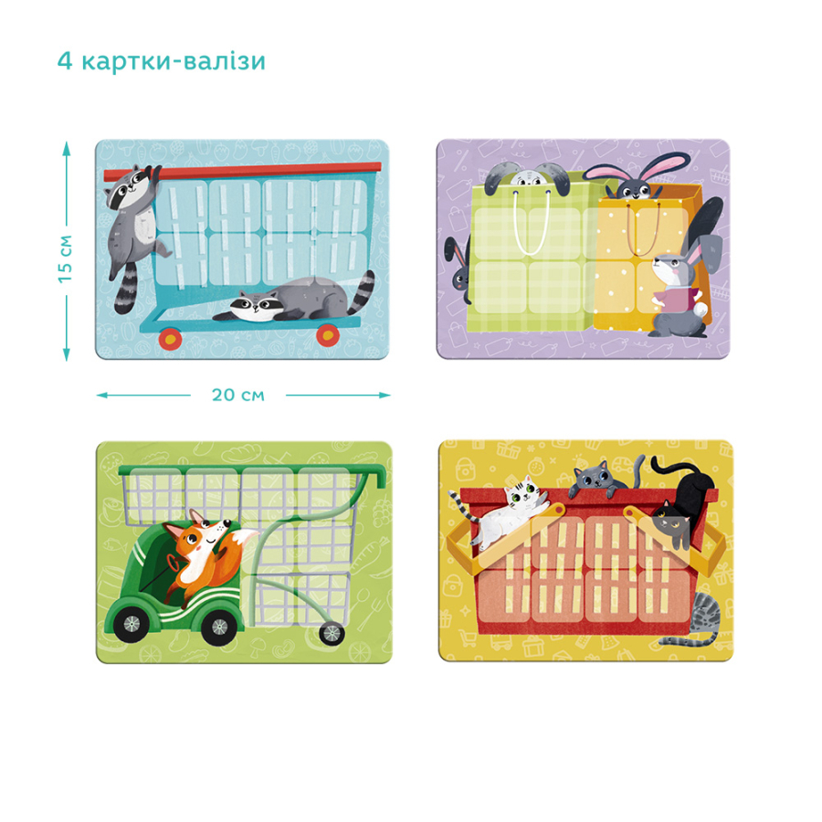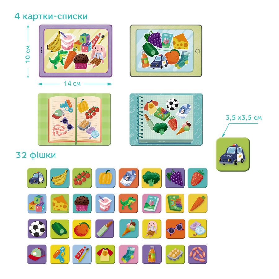 Комплектація 4 картки-валізи, 4 картки-списки, 32 фішки