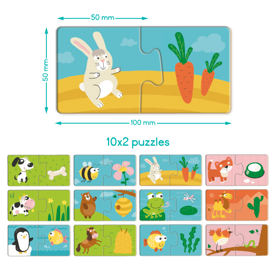 Цей пазл-duo — не просто гра, а справжня пригода у світ тварин: дитина поєднує дві частини картинок, щоб скласти цілу тваринку. Кожна пара елементів — це яскрава, барвиста ілюстрація знайомих звіряток, які викликають усмішку та цікавість.