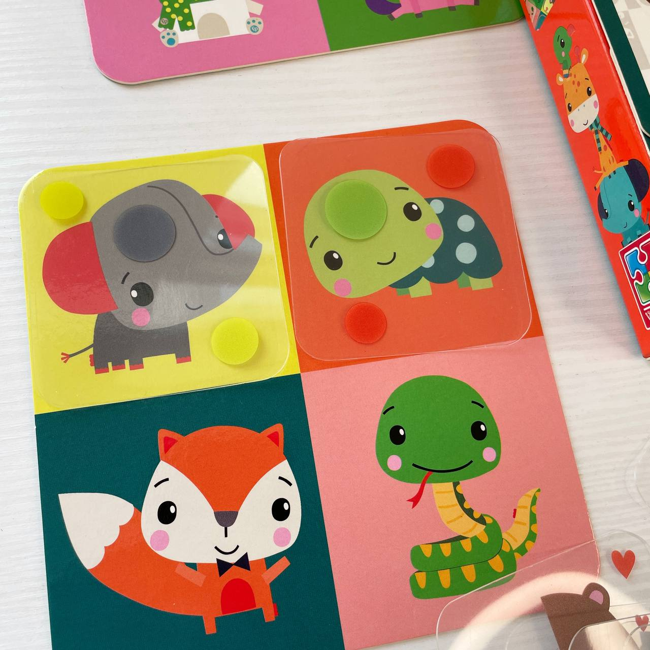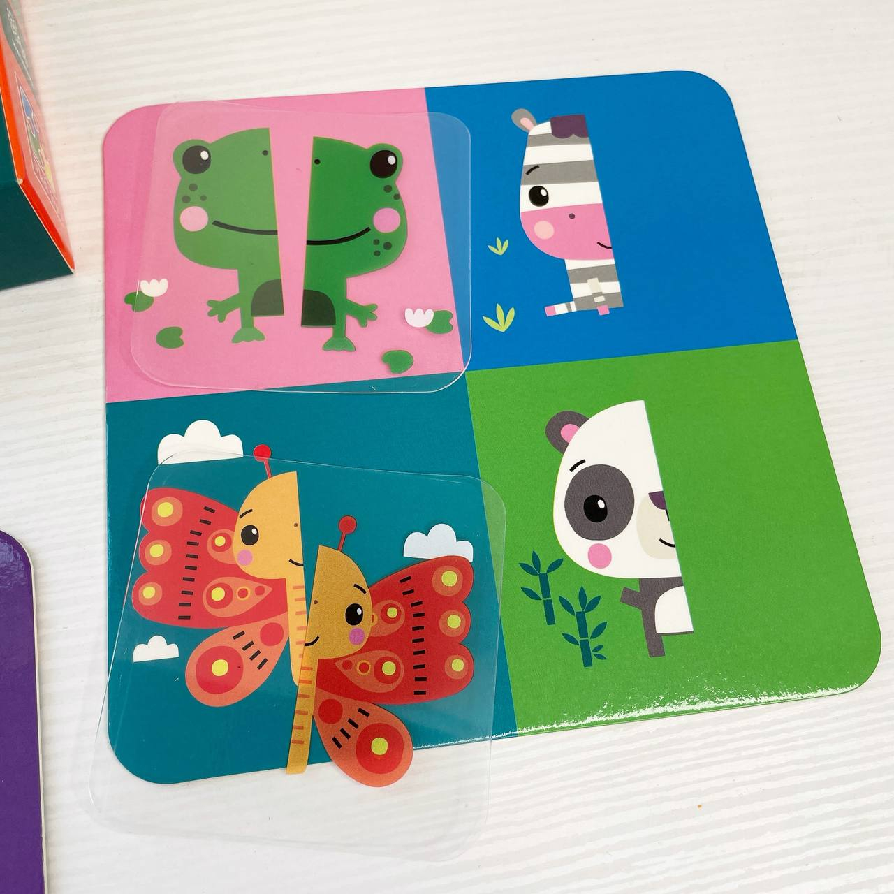 Гра складається з двох комплектів карток. Завдання для малюка – знайти другу половинку для кожної картки, щоб отримати повноцінне зображення.