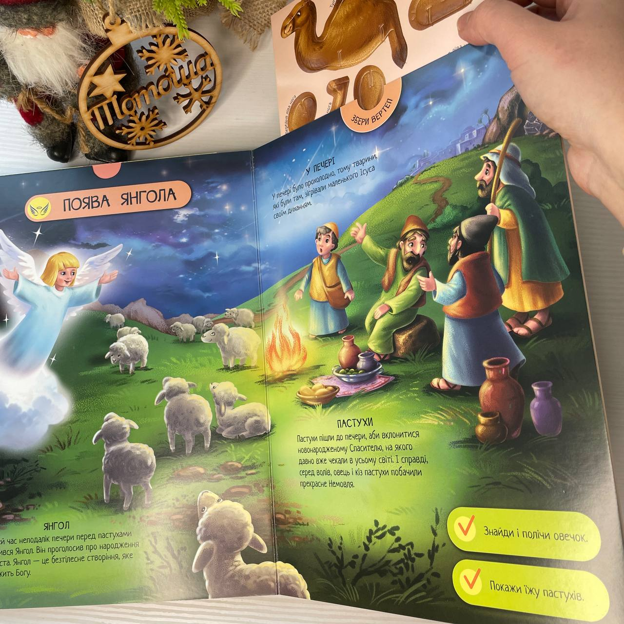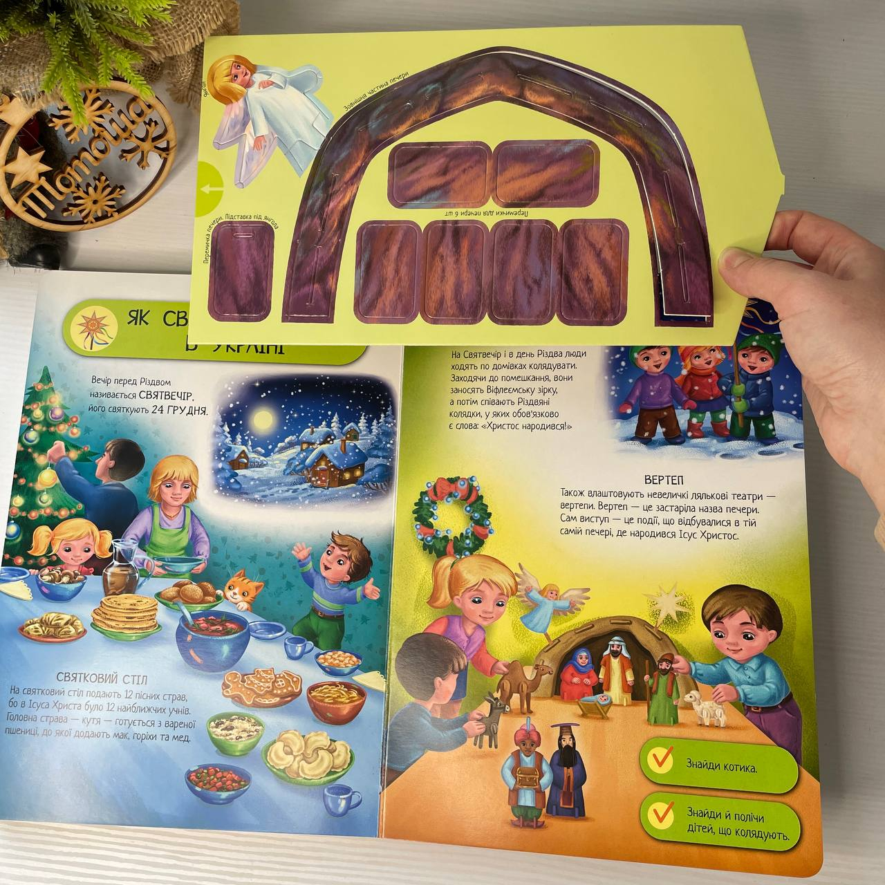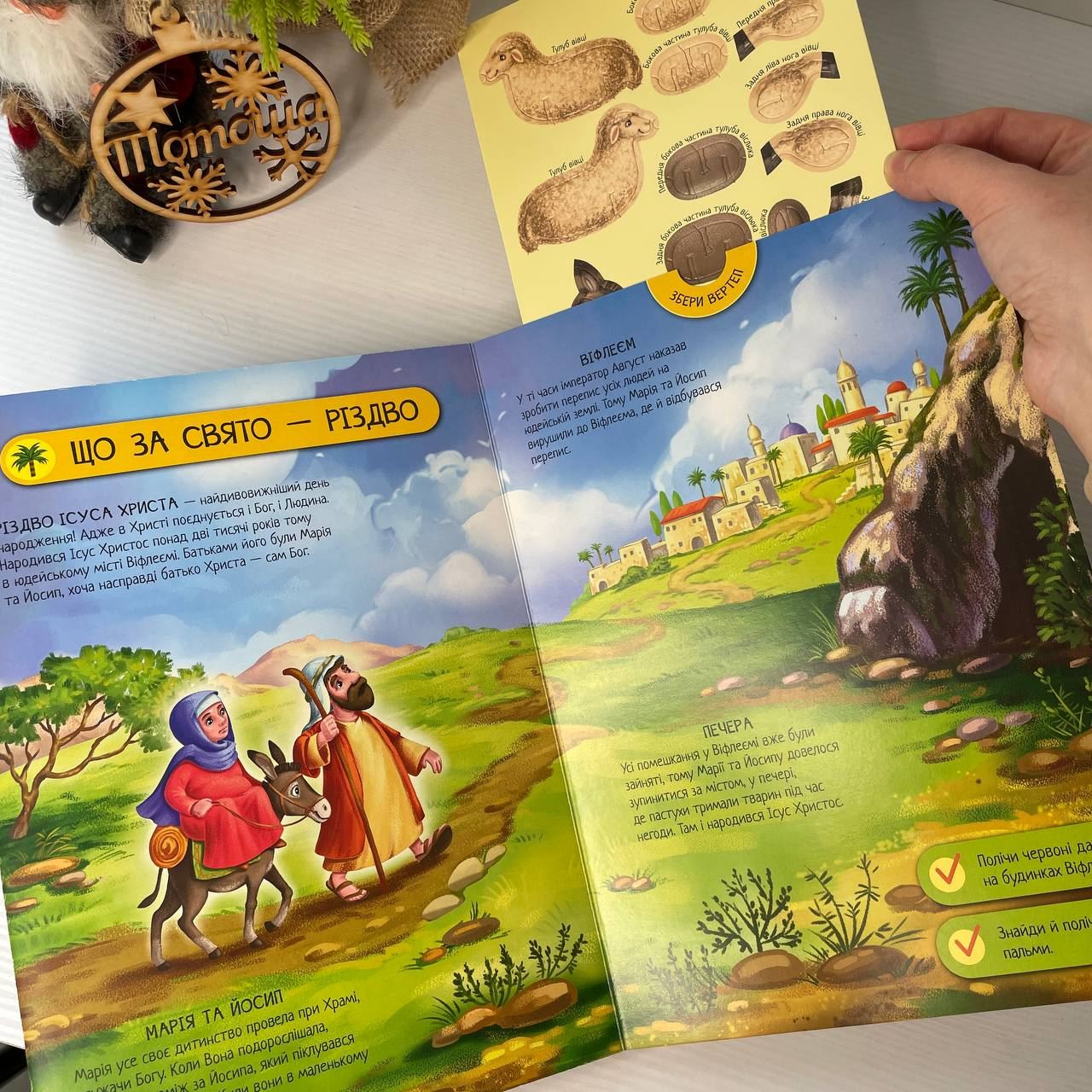 С этой книгой малыш точно не заскучает: яркие и подробные картинки, которые можно рассматривать часами; множество героев для знакомства; краткие и понятные для ребенка факты о Рождестве и, конечно, игры на внимание! Но самое интересное в этой книге – это 3D-модель вертепа, которую ребенок сможет собрать сам. Просто вытаскивайте письмо с деталями вертепа и героев из потайного кармана и собирайте их!