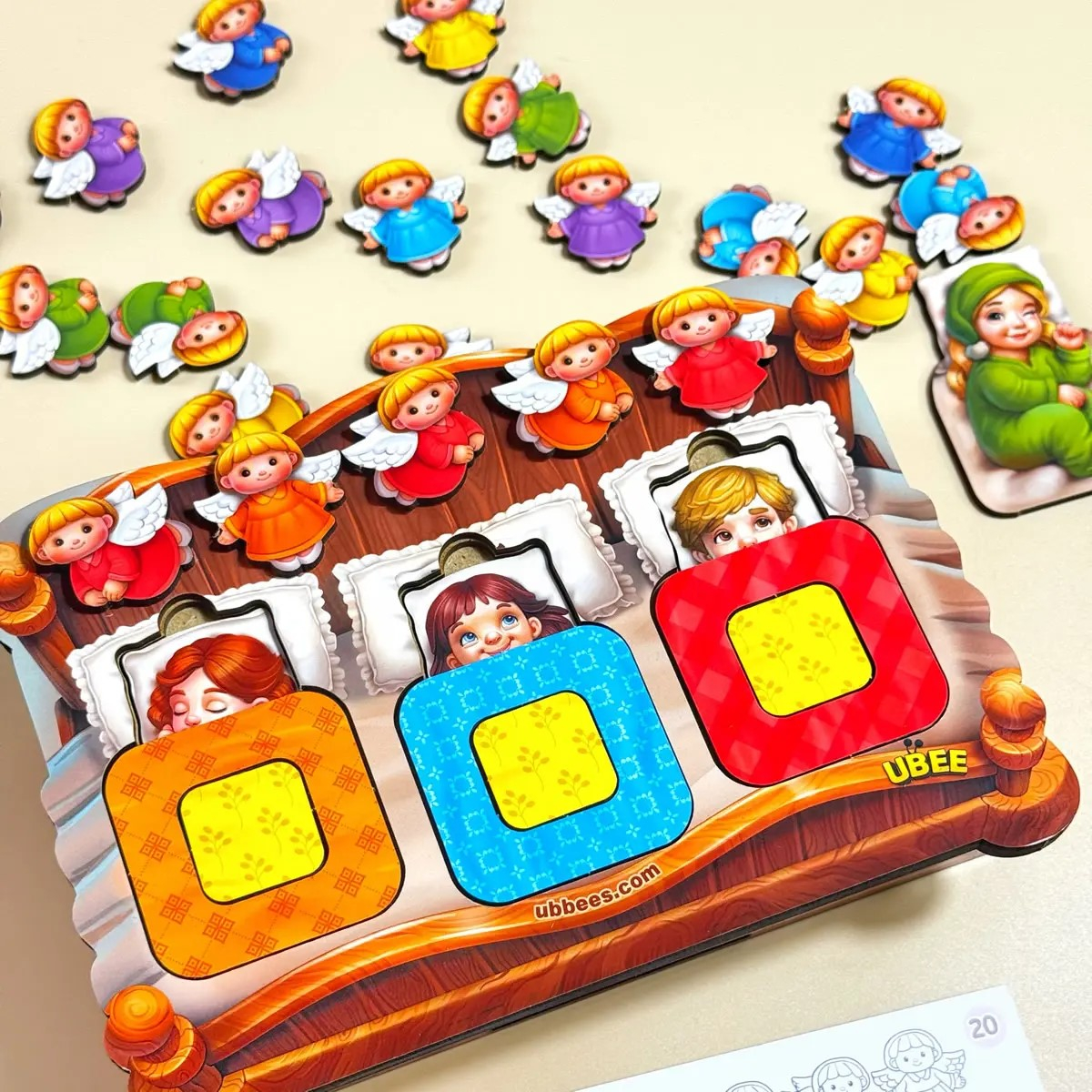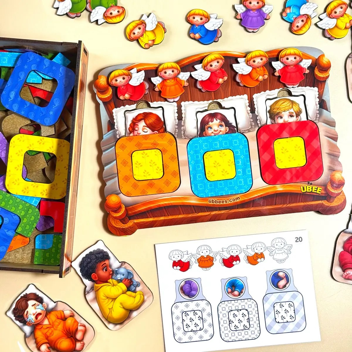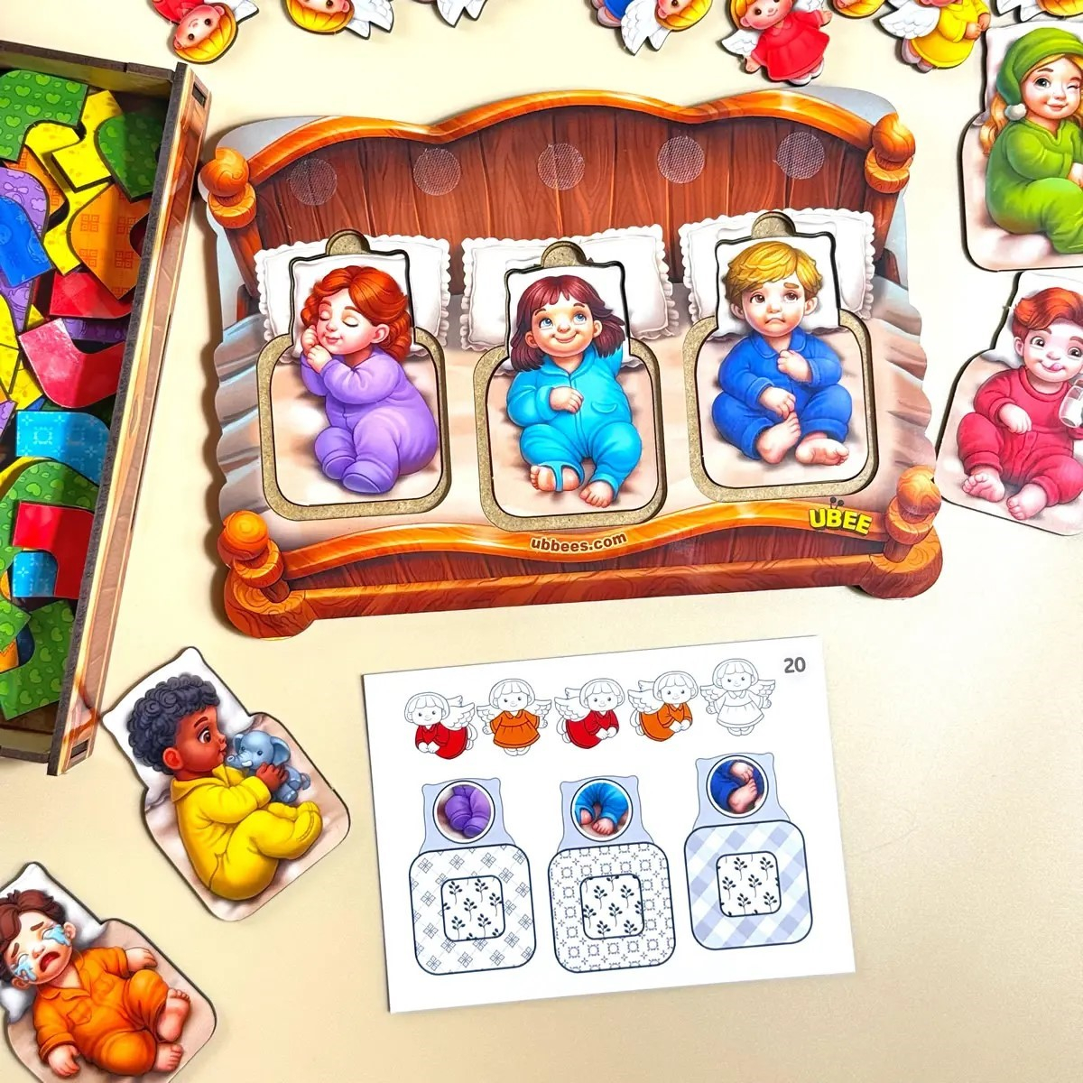 Деревянная развивающая игра пазл-сортер с вкладками «Малыши в кроватке» ПСД303