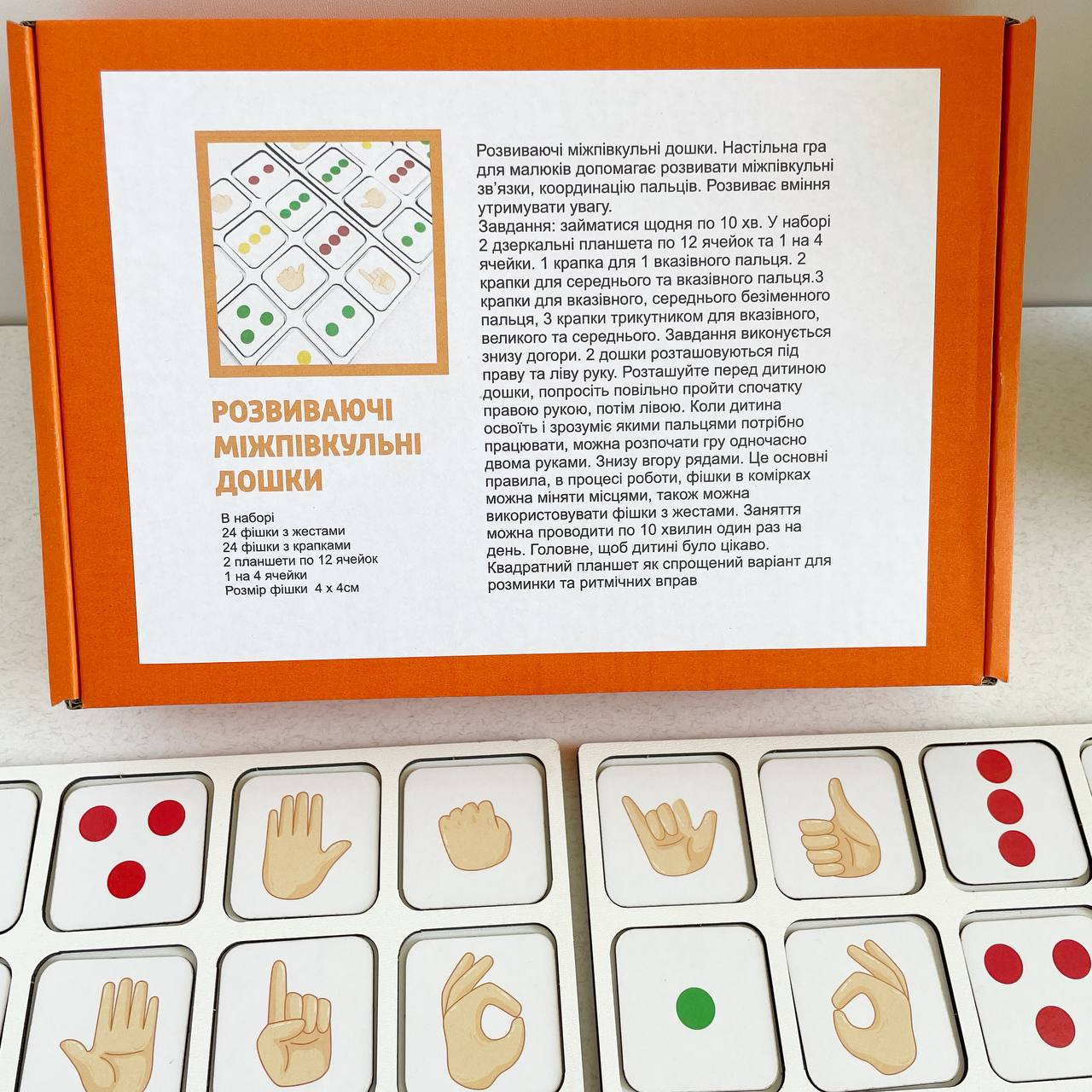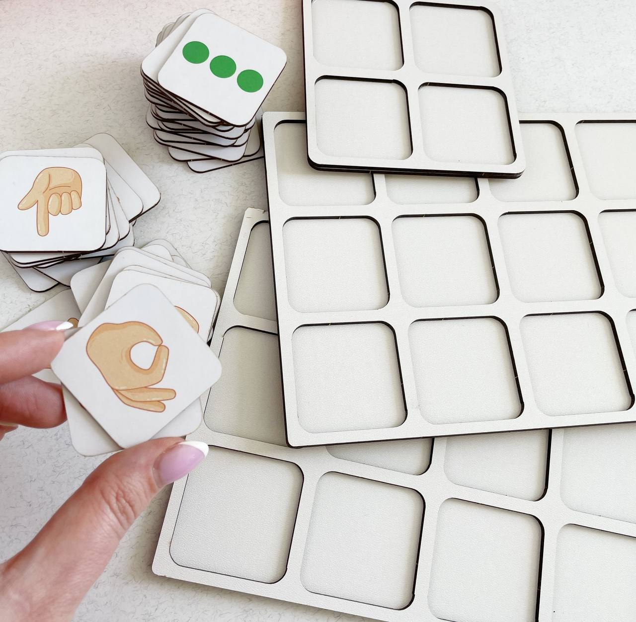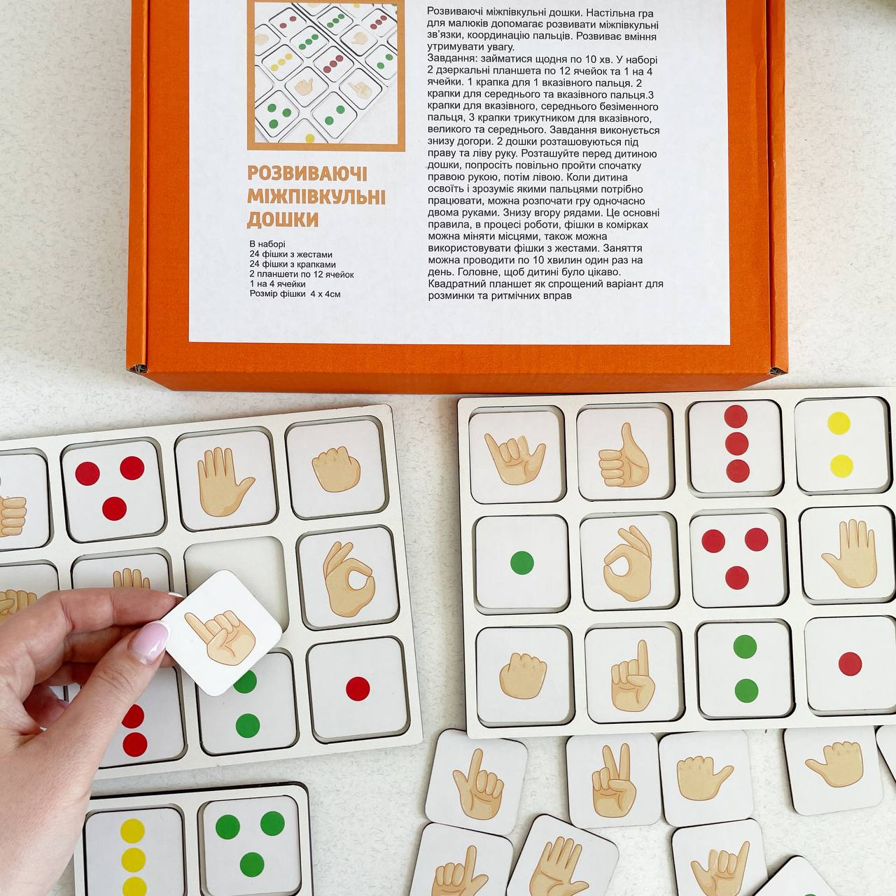 Задание: заниматься ежедневно по 10 мин. В наборе 2 зеркальных планшета по 12 ячеек и 1 на 4 ячейки. 1 точка для 1 указательного пальца. 2 точки для среднего и указательного пальца.3 точки для указательного, среднего безымянного пальца; 3 точки треугольником для указательного, большого и среднего. Задание выполняется снизу вверх. 2 доски размещаются под правую и левую руку. Разместите перед ребенком доски, попросите медленно пройти сначала правой рукой, затем левой. Когда ребенок освоит и поймет, какими пальцами нужно работать, можно начать игру одновременно двумя руками. Снизу вверх рядами. Это основные правила, в процессе работы фишки в ячейках можно менять местами, также можно использовать фишки с жестами. Занятия можно проводить по 10 минут один раз в день. Главное, чтобы ребёнку было интересно. Квадратный планшет как упрощенный вариант для разминки и ритмичных упражнений