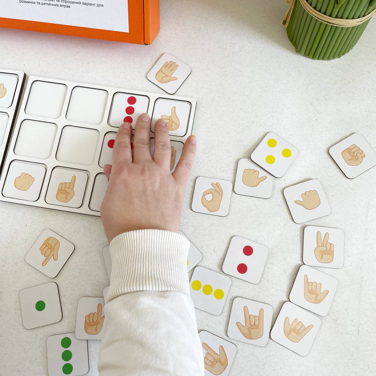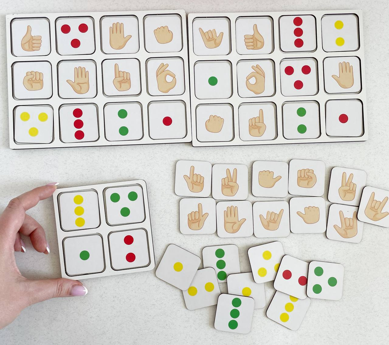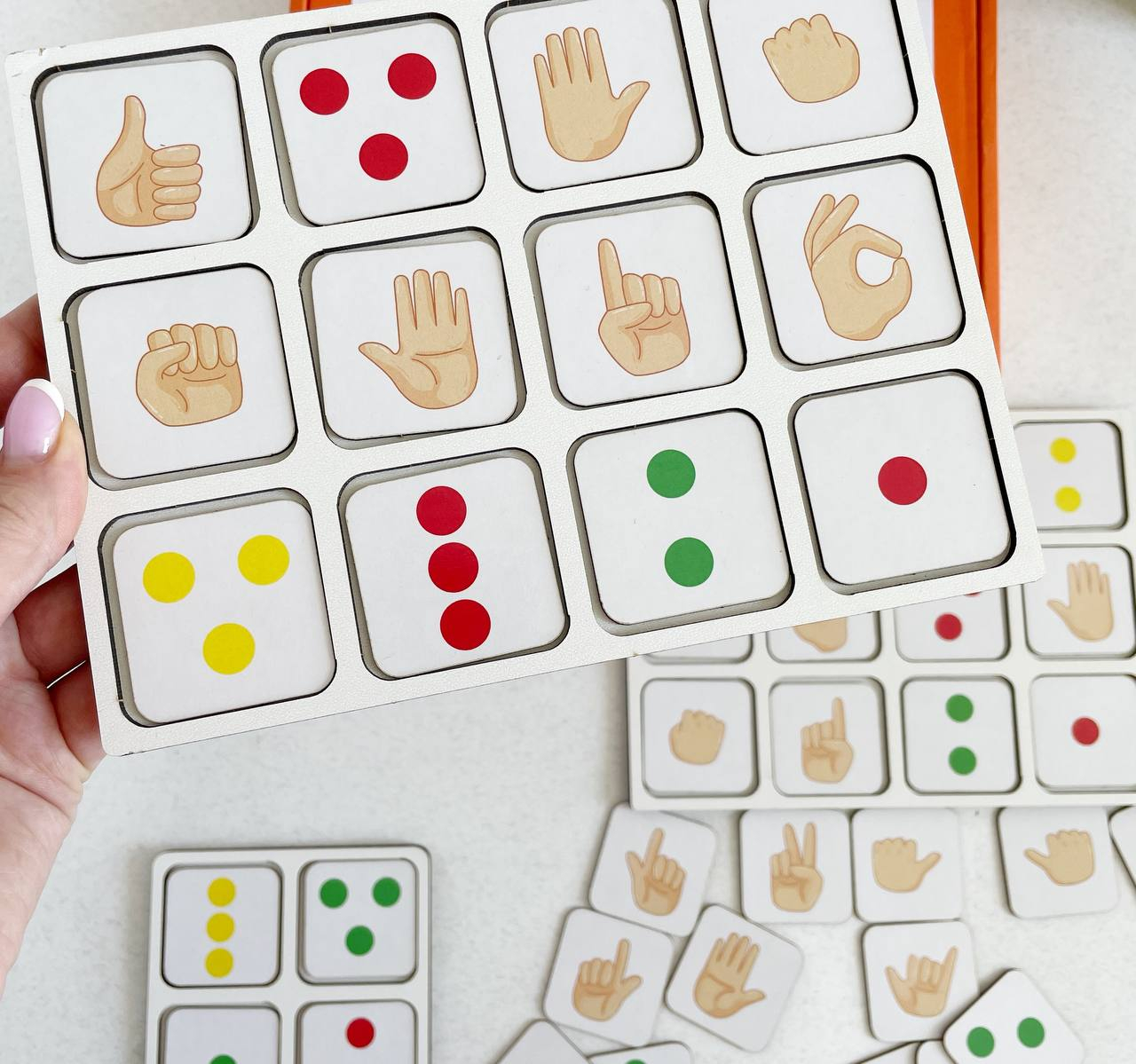 Задание: заниматься ежедневно по 10 мин. В наборе 2 зеркальных планшета по 12 ячеек и 1 на 4 ячейки. 1 точка для 1 указательного пальца. 2 точки для среднего и указательного пальца.3 точки для указательного, среднего безымянного пальца; 3 точки треугольником для указательного, большого и среднего. Задание выполняется снизу вверх. 2 доски размещаются под правую и левую руку. Разместите перед ребенком доски, попросите медленно пройти сначала правой рукой, затем левой. Когда ребенок освоит и поймет, какими пальцами нужно работать, можно начать игру одновременно двумя руками. Снизу вверх рядами. Это основные правила, в процессе работы фишки в ячейках можно менять местами, также можно использовать фишки с жестами. Занятия можно проводить по 10 минут один раз в день. Главное, чтобы ребёнку было интересно. Квадратный планшет как упрощенный вариант для разминки и ритмичных упражнений