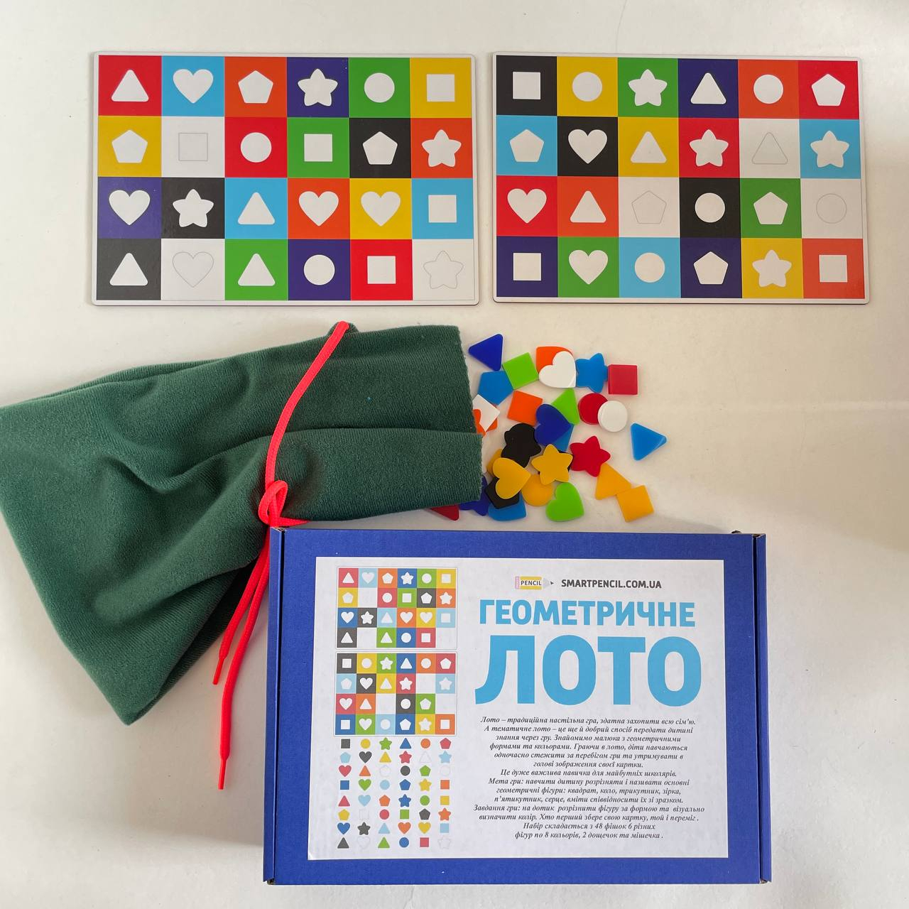 Знакомим малыша с геометрическими формами и цветами. Играя в лото, дети учатся одновременно следить за ходом игры и удерживать в голове изображение своей карты.