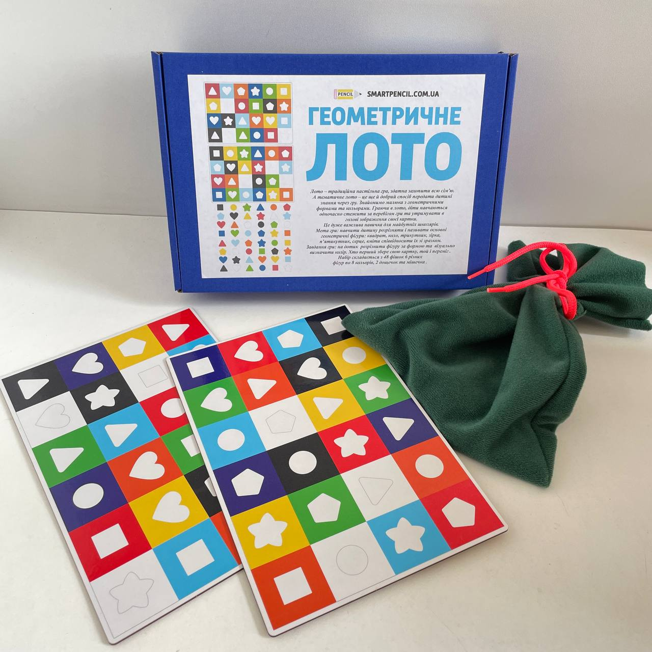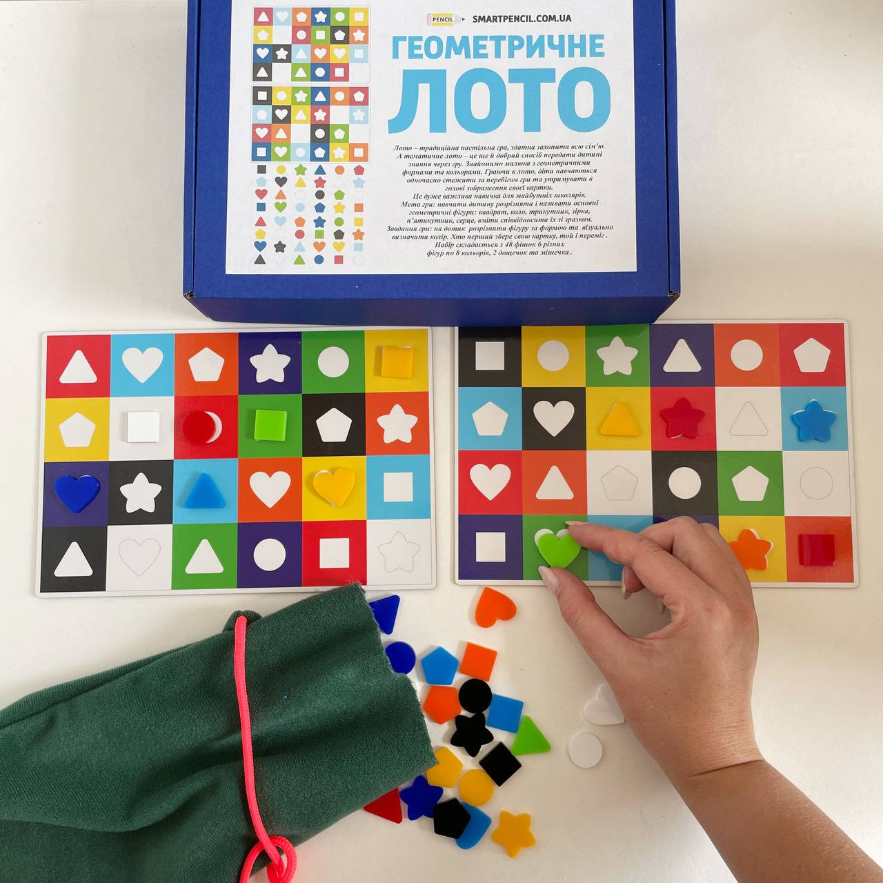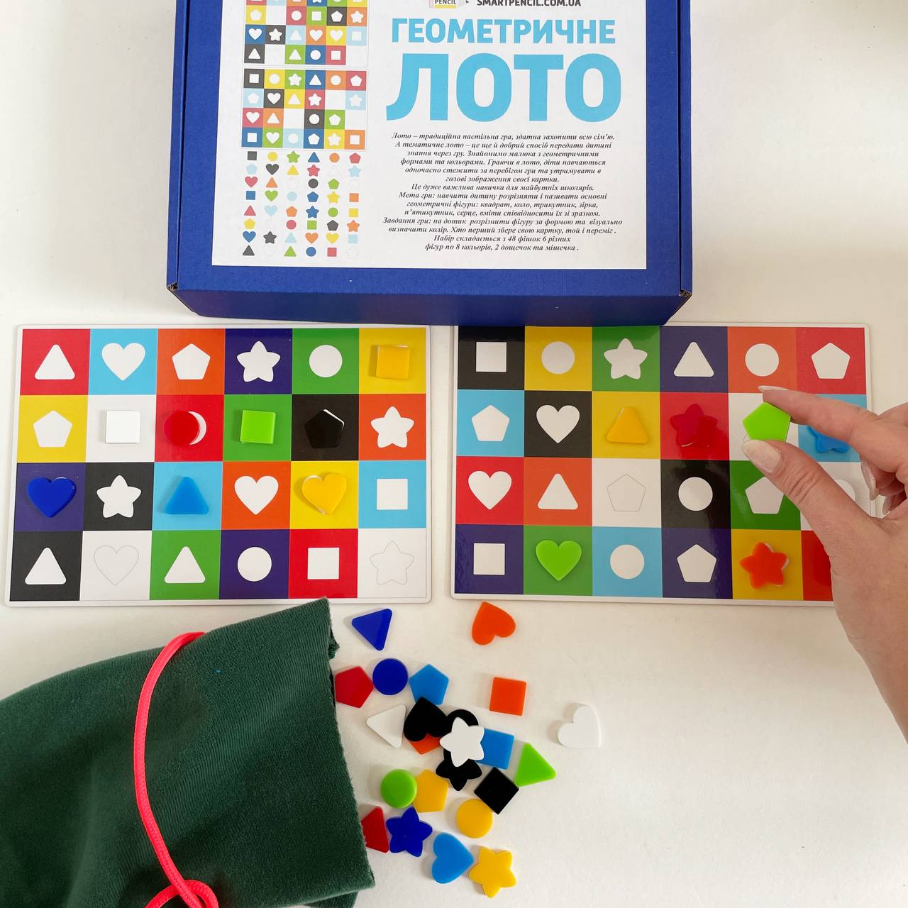 Задание игры: на ощупь различить фигуру по форме и визуально определить цвет. Кто первый соберет свою карточку, тот и победил.