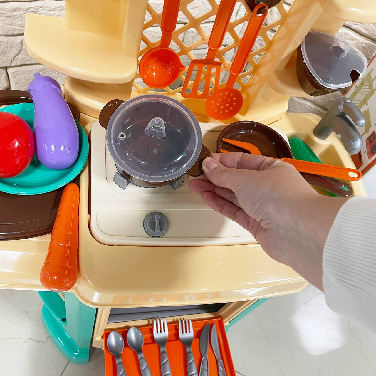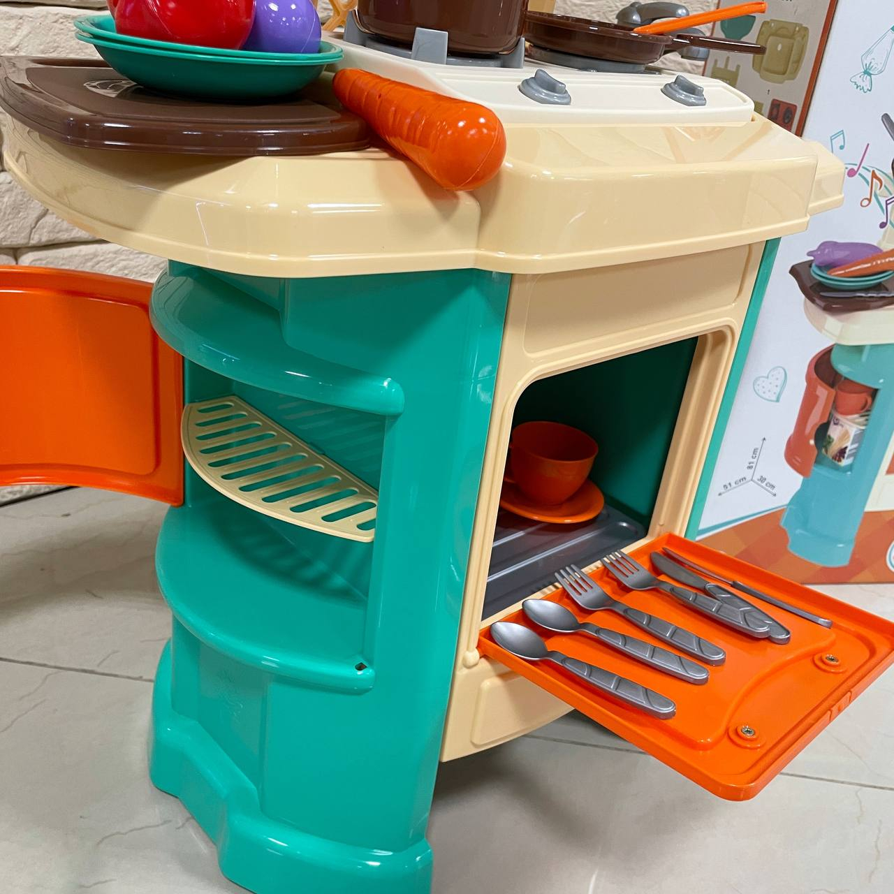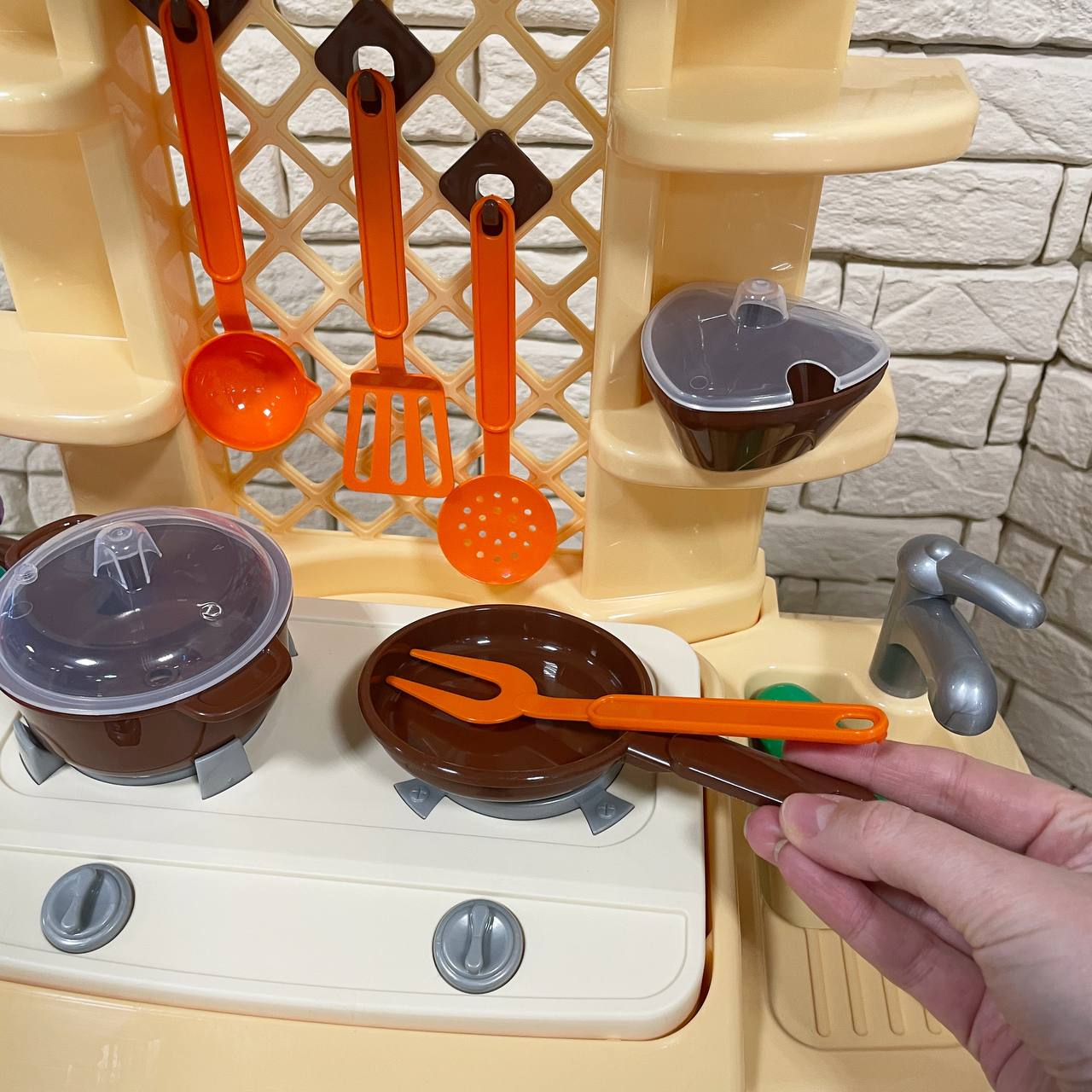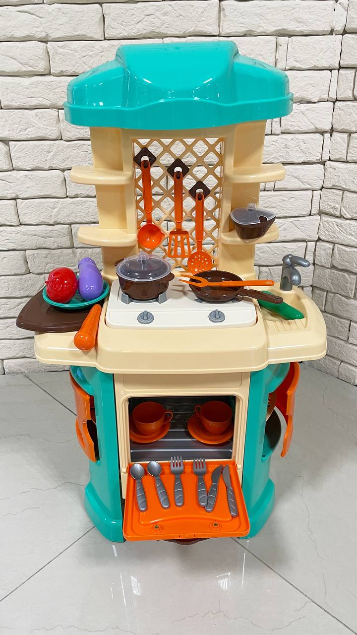 по мнению дизайнеров, лучше всего передает домашний уют настоящей кухни. Такое цветовое решение будет отвечать не только мечтам маленьких хозяек, а и будущих шеф-поваров. И, кто знает, возможно эта кухня станет для малыша первым шагом в увлекательный мир современной "высокой кулинарии». В наборе вместе с игрушечной кухней вся необходимая посуда для приготовления вкусных блюд. Есть кастрюлька с прозрачной крышкой (с отверстиями для прохождения пара), сковородка, доска для нарезки и яркие овощи. Две картонные коробочки с «спагетти» и «хлопьями» для приготовления полезных завтраков, а для чаепития - две чашки с блюдечками и сахарница. А после вкусного обеда - надо помыть посуду. Для этого есть мойка с краном и мочалка в форме цветочка.