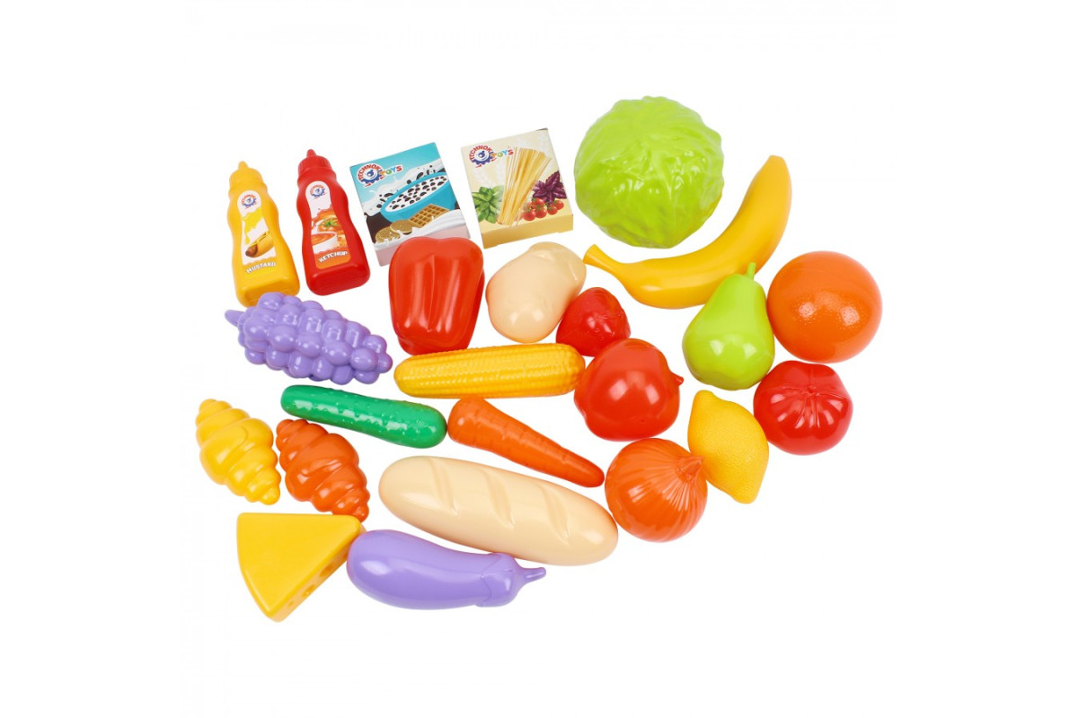 Набор укомплектован прилавком с полками и разнообразными аппетитными игрушечными продуктами: сочной клубникой, спелыми бананами, ароматным батоном, сыром и другими. Ассортимент включает круассаны, хлеб, картофель, капусту, огурцы, помидоры, морковь, перец, баклажаны, лук, яблоки, груши, виноград, лимоны, апельсины и многое другое. Особый акцент – тортовщица для самых изысканных товаров и верхние полки для размещения акционных продуктов. В комплекте также две картонные коробки со "спагетти" и "хлопьями" и бутылочки с "кетчупом" и "горчицей".