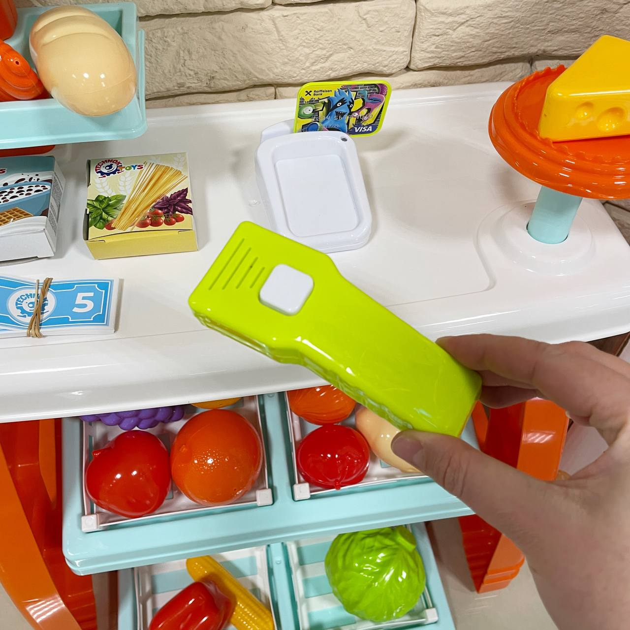 Главной изюминкой набора является стильный банковский терминал со сканером и банковской картой. Ребёнок сможет "сканировать" товары и принимать "оплаты", чувствуя себя настоящим кассиром. В игру добавляются игровые деньги и декоративные наклейки, что делает процесс игры еще более интересным и реалистичным.