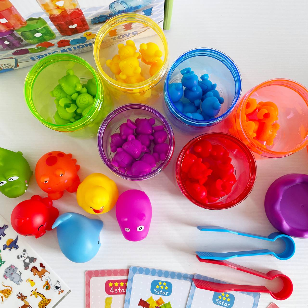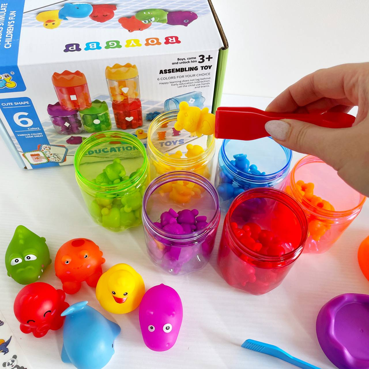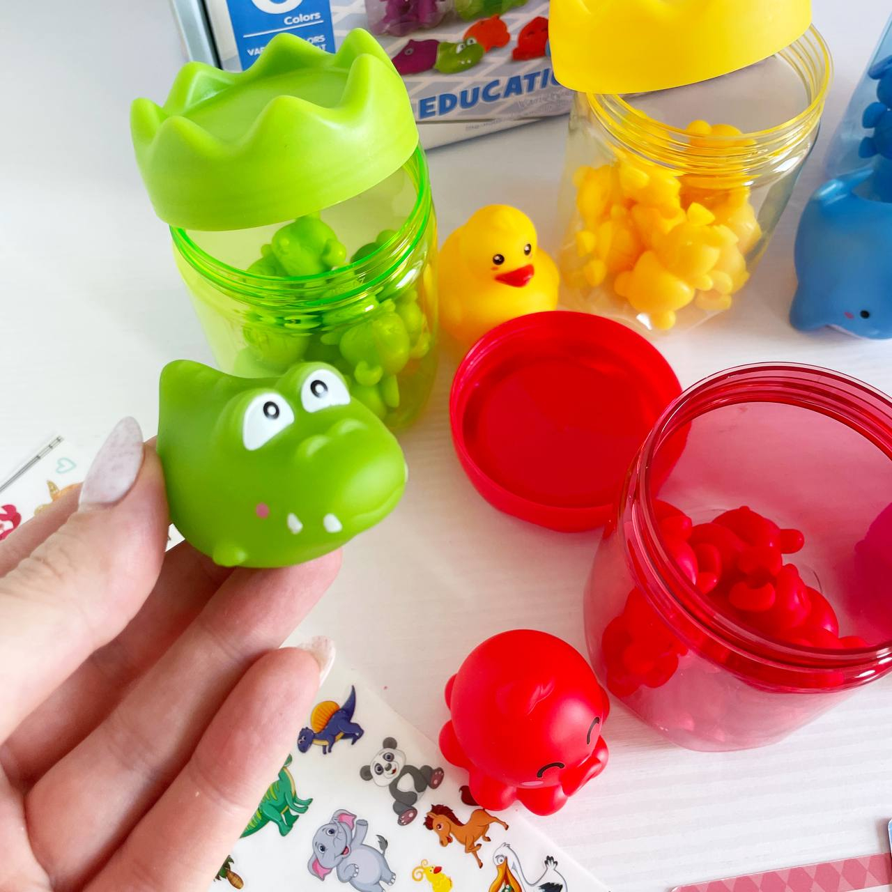 - 6 пластиковых контейнеров с фигурками животных соответствующих цветов.