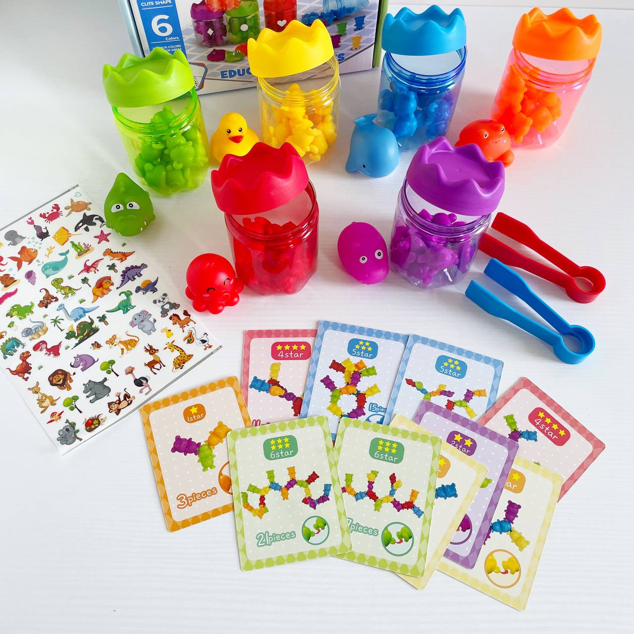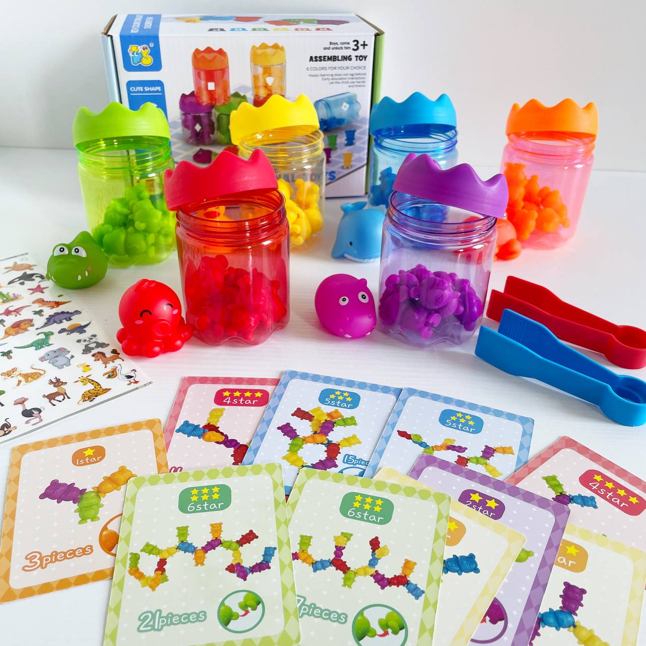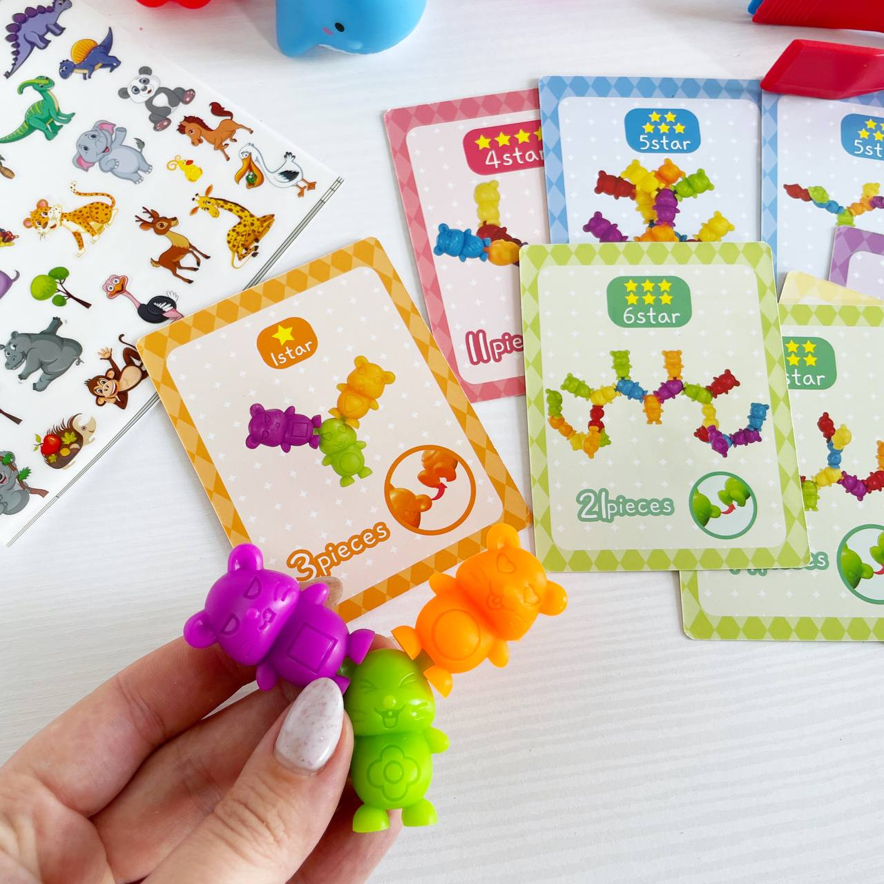 В комплекте предусмотрены пластиковые контейнеры, в которых находятся фигурки животных, каждое из которых соответствует своему цвету. Фигурки животных выполняют функцию деталей конструктора, а специальные карточки с заданиями предлагают детям создавать разнообразные комбинации, помогая развивать логическое мышление.
