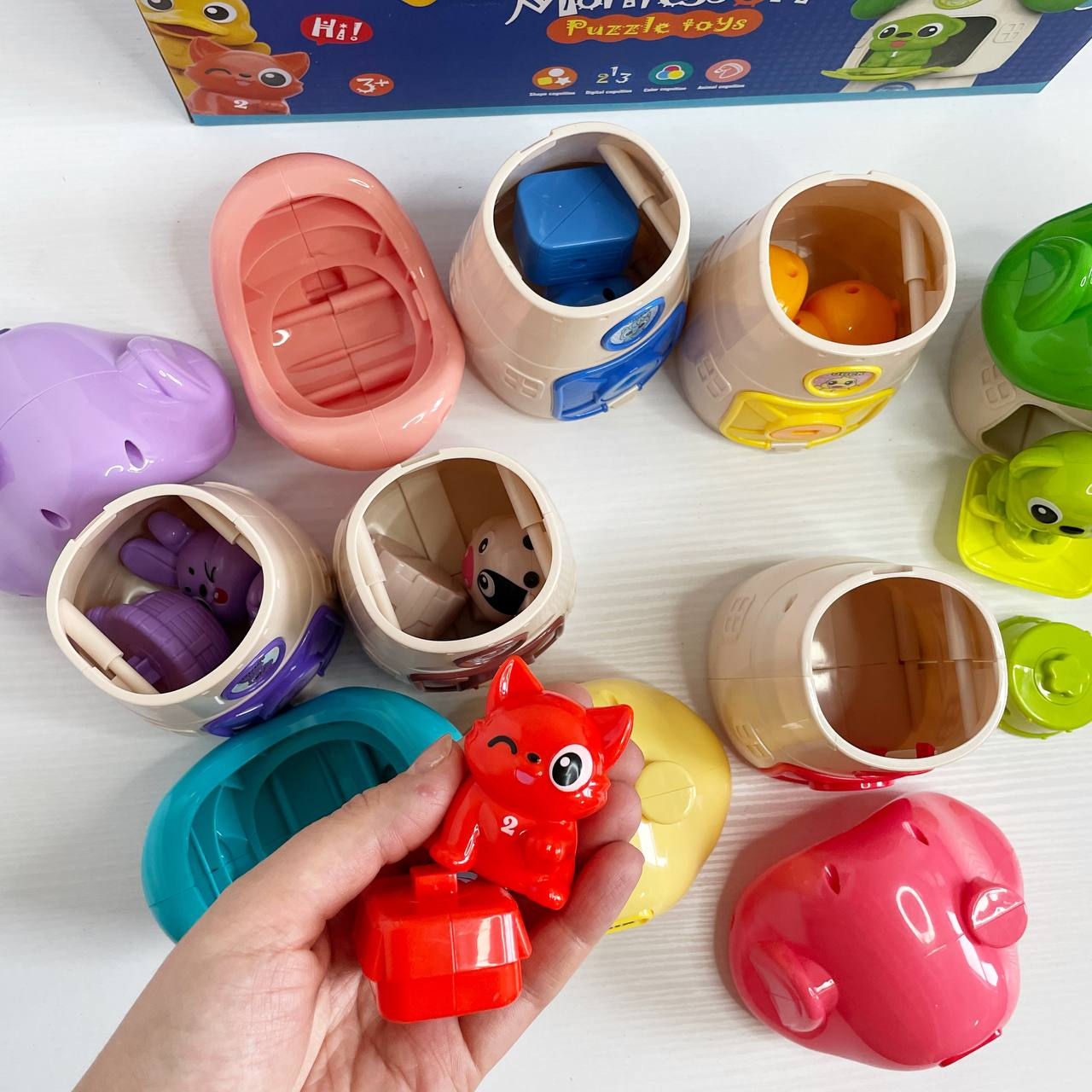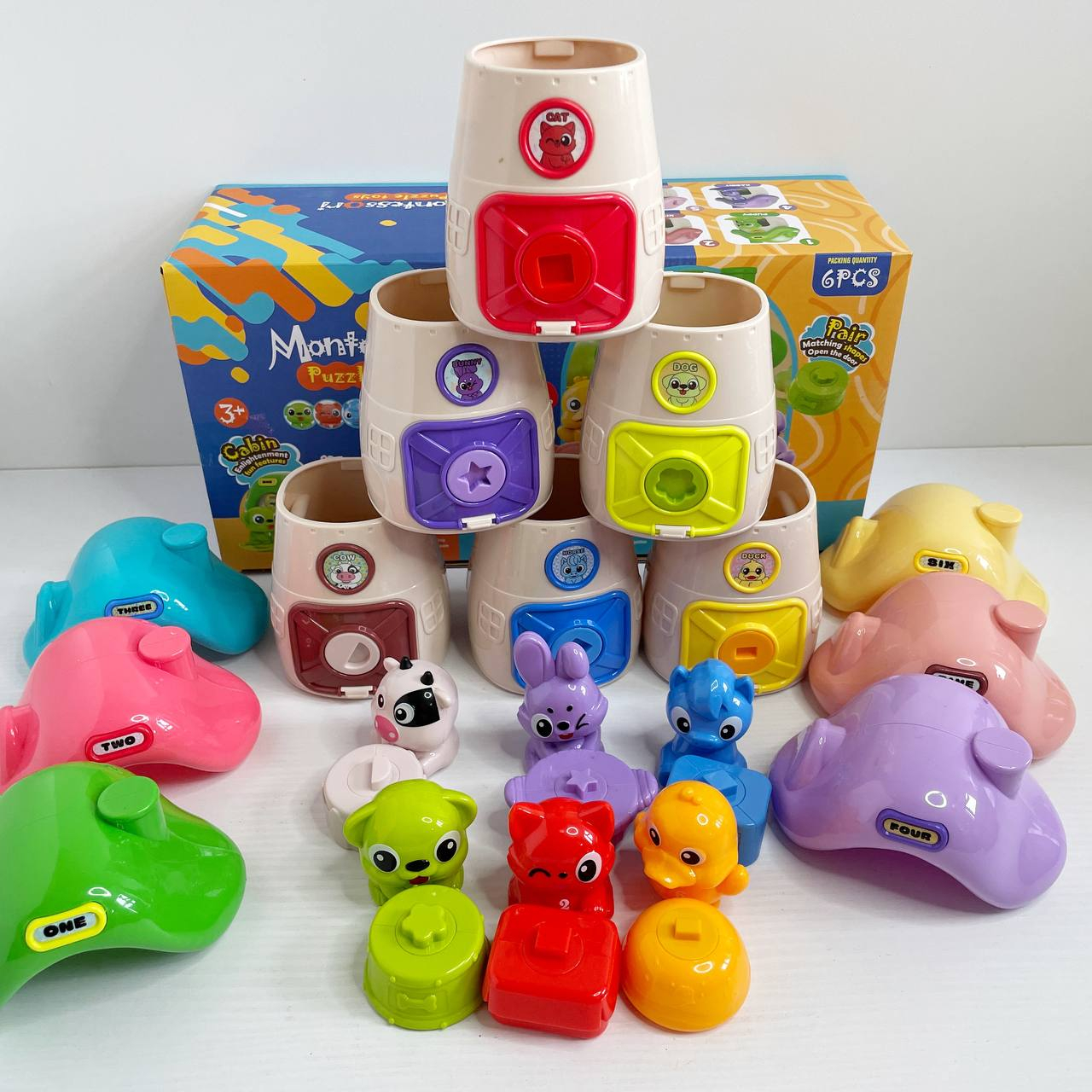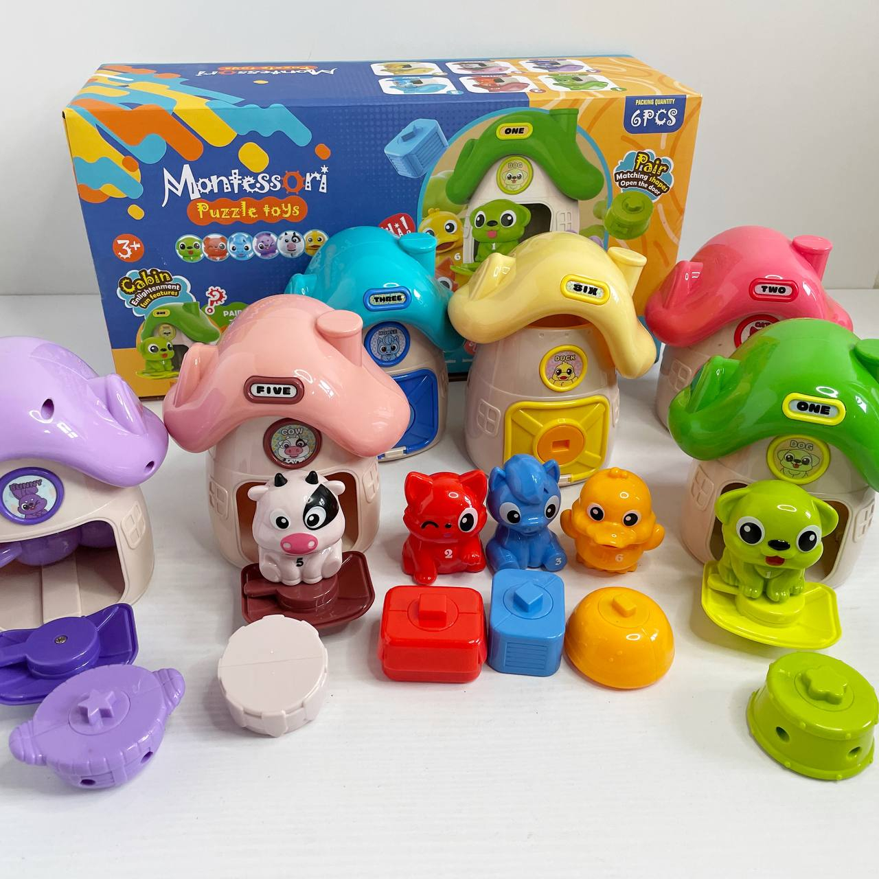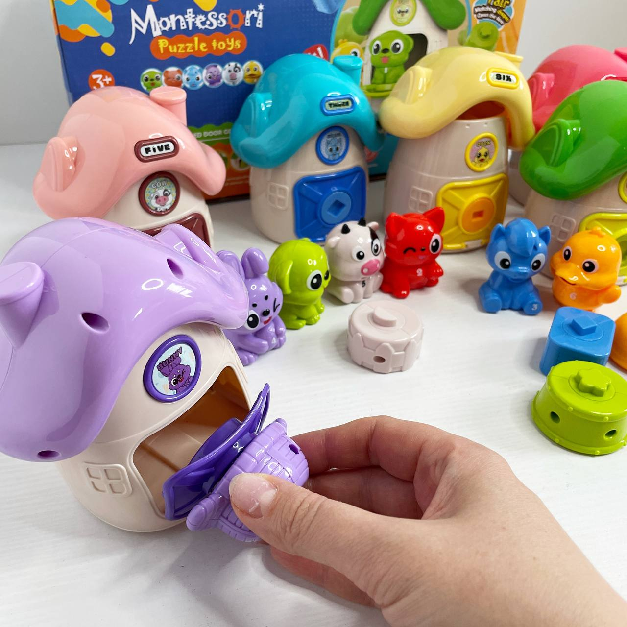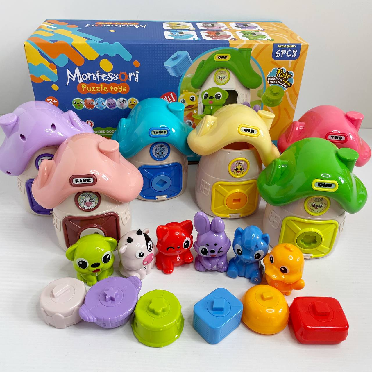 Логическая игра Монтессори (6 домиков, 6 животных, цифры, надписи на английском языке, открывается д