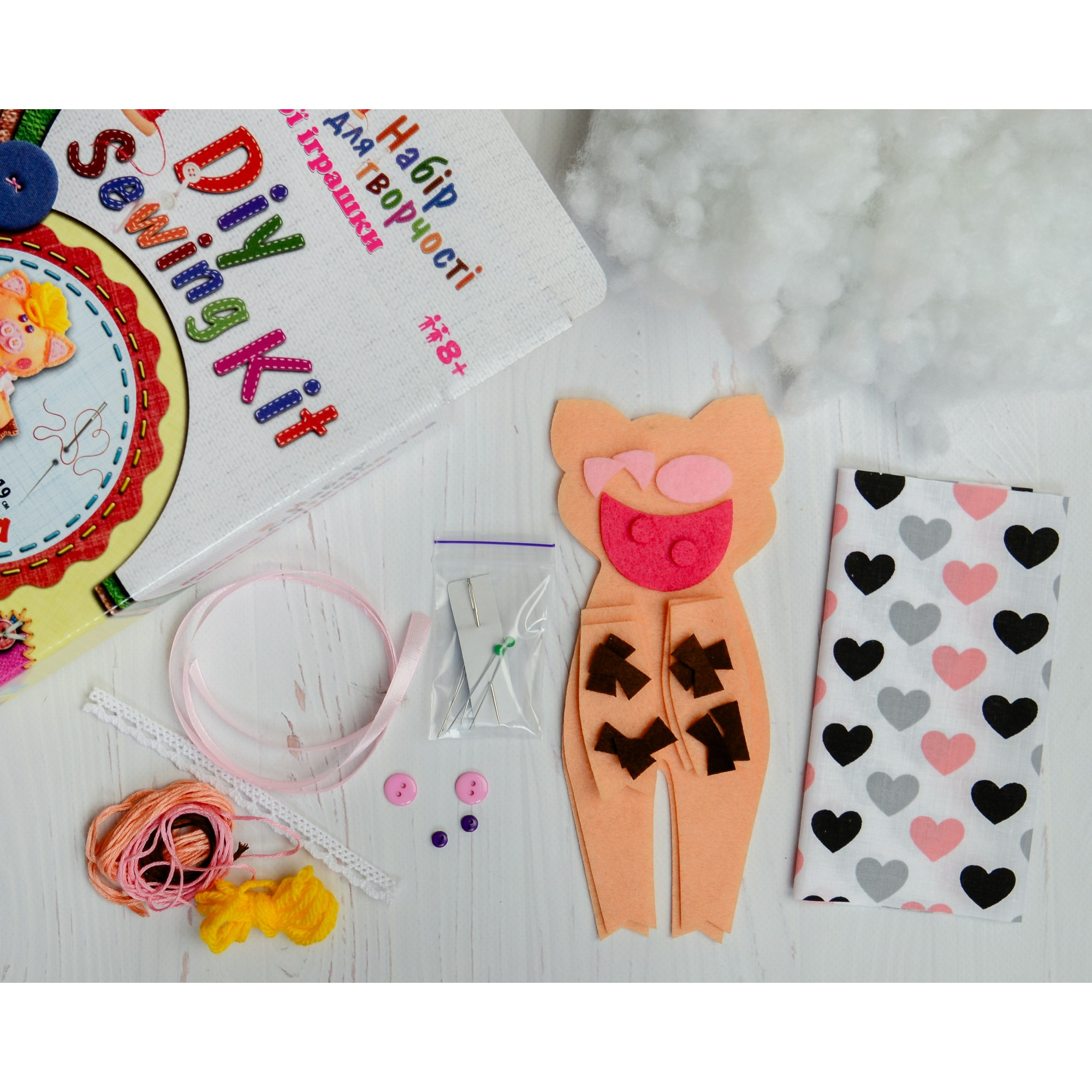 В наборе: вырубка из фетра, хлопчатобумажная ткань, нити мулине, пуговицы, игла для шитья, холофайбер, атласная лента, кружево, булавки портняжные.