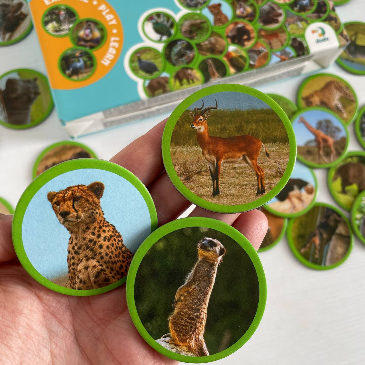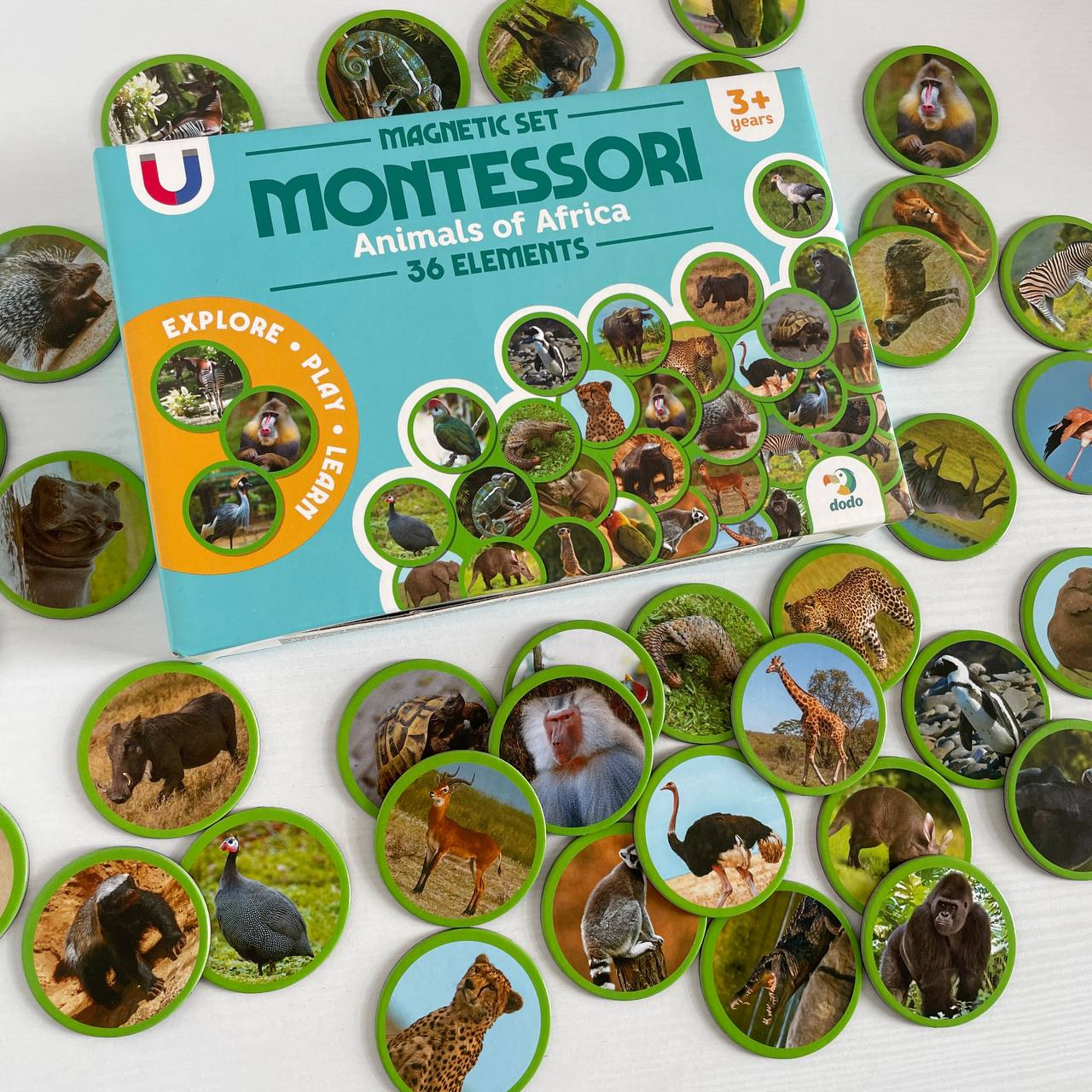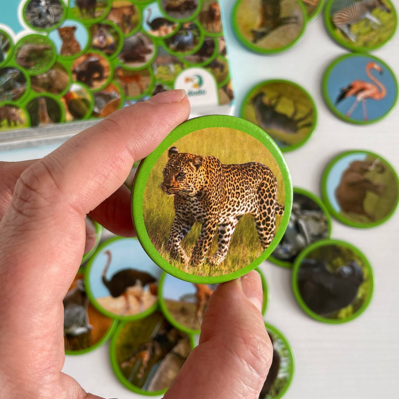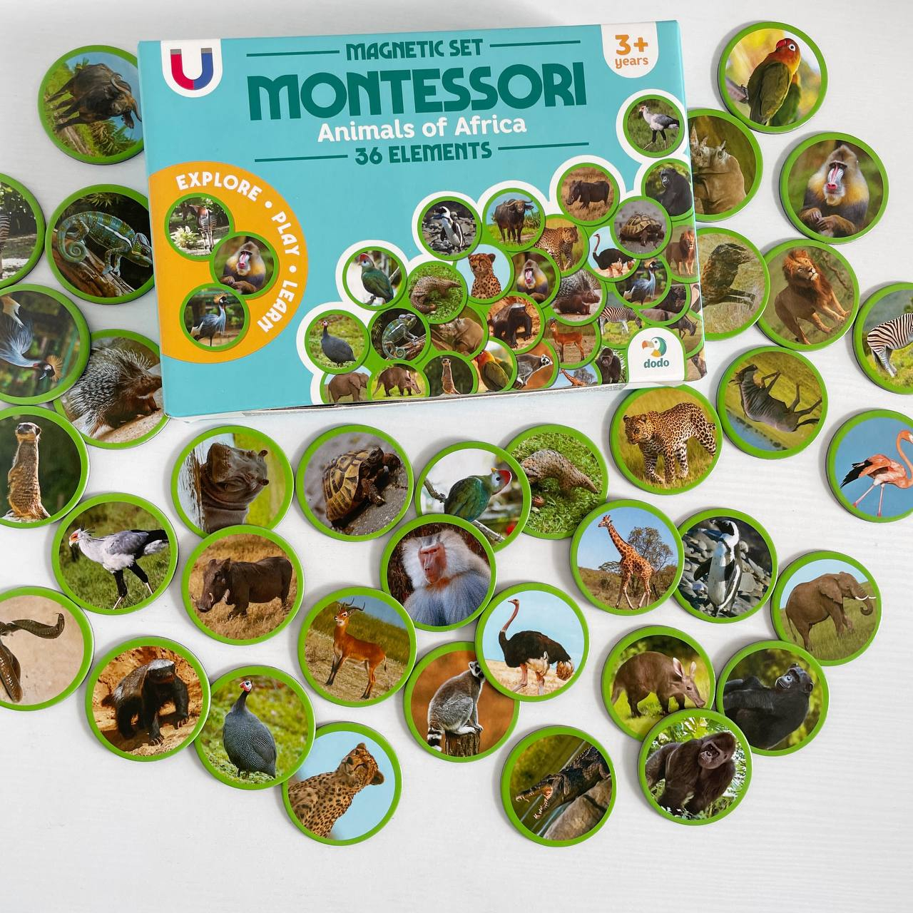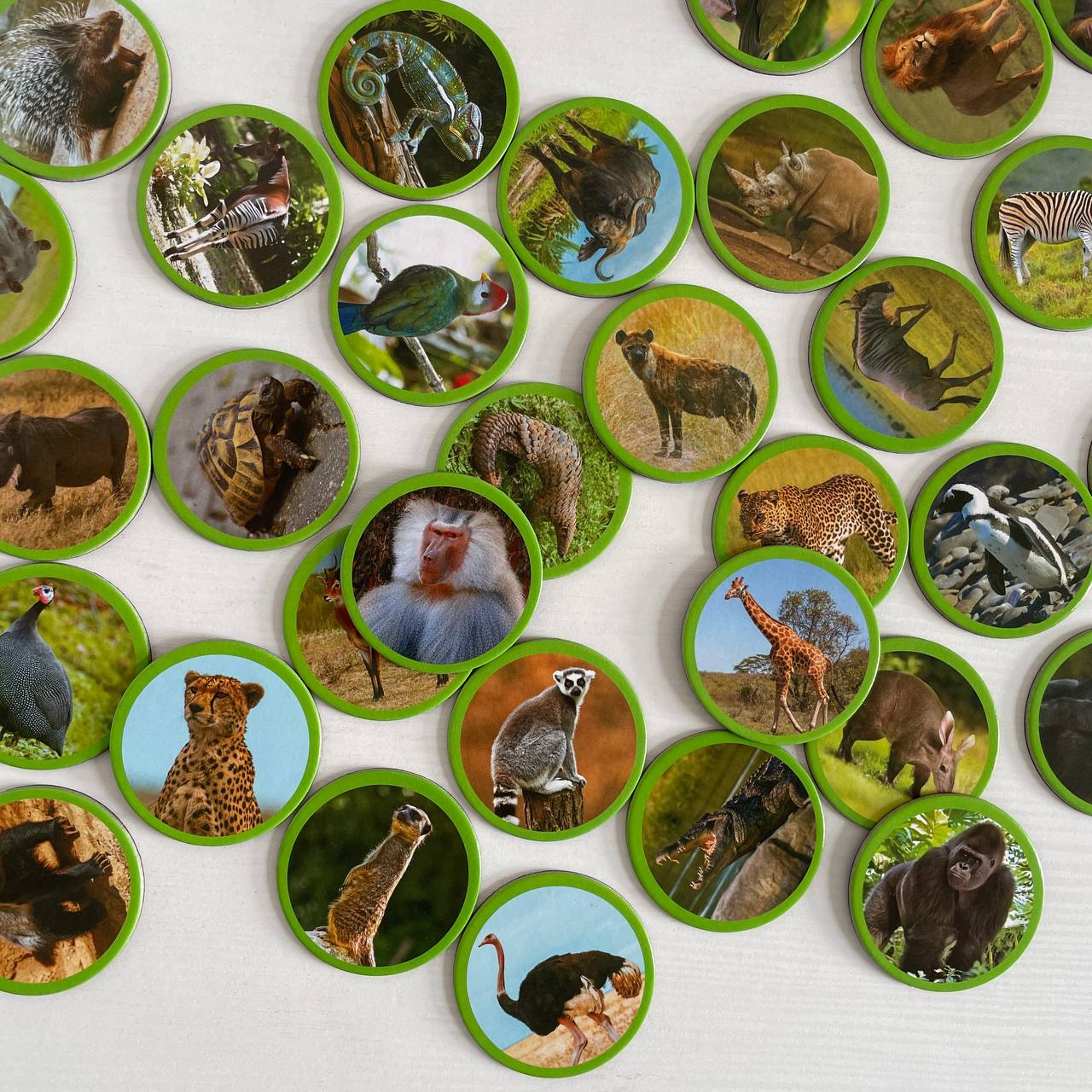 36 магнитов с изображениями реальных животных Африки: бегемот, фламинго, крокодил, зебра, гиена, фазан, сурикат и многие другие;
