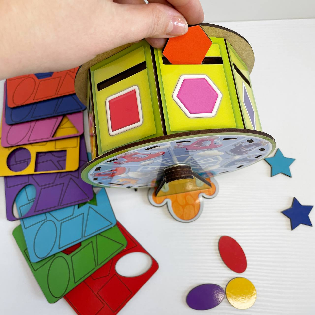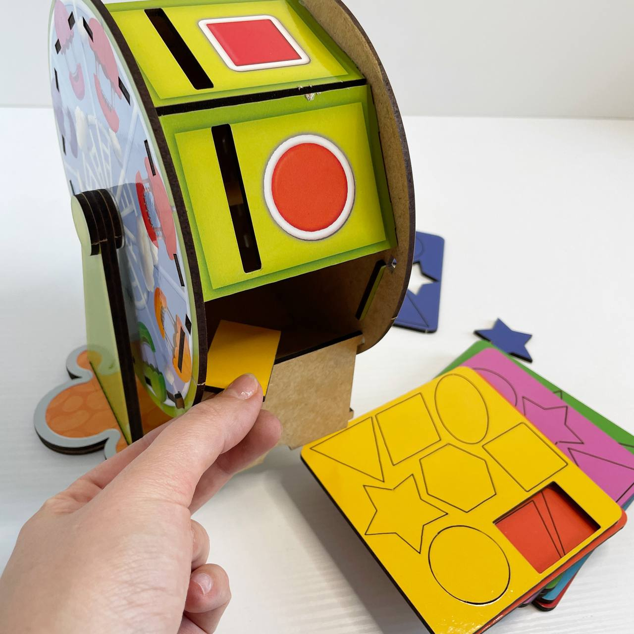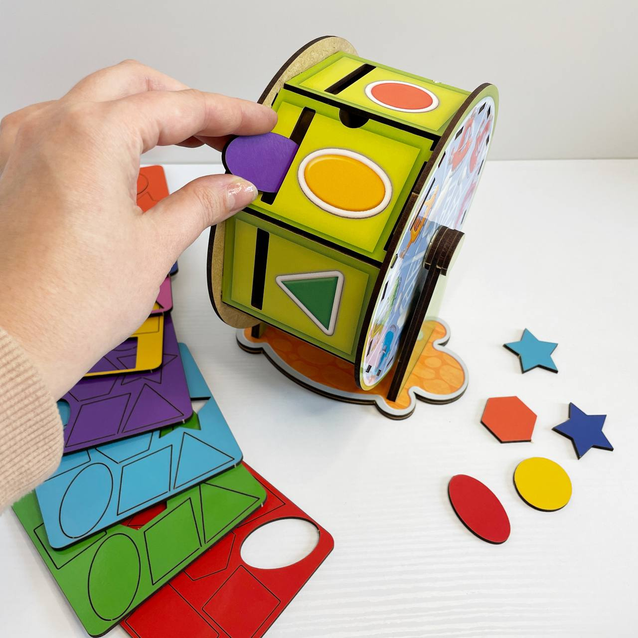 Задача дитини: правильно все розсортувати, обертаючи барабан. Вивчайте кольори, рахунок, геометричнi фiгури. Трафарети з фiгур можна використовувати для малювання. Розвивайтеся, весело граючи!