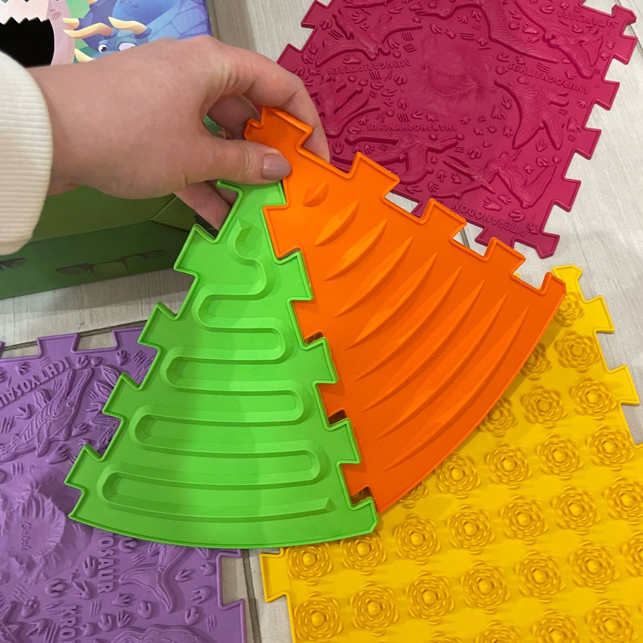 Набори із трикутними поворотними пазлами дозволяють створювати хвилясті доріжки, круги, візерунки, перетину. Таким чином ви зможете створювати маршрути навколо предметів меблів, кутів, економити місце в кімнаті, а головне – стимулювати фантазію та інтерес дітей до занять на килимках.